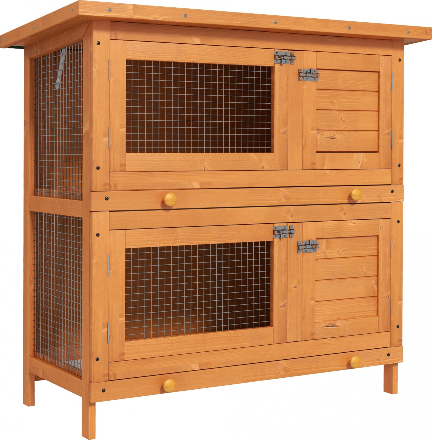 Tato bouda pro malá zvířata od společnosti je natřena ekologickou barvou na vodní bázi a má šikmou střechu, která udrží vaše zakrslé králíky v bezpečí a suchu téměř za každého počasí. Horní a dolní patro jsou konstrukčně shodné. Zvýšená konstrukce chrání vaše zvířata před vlhkem a chladem. Díky mnoha oknům a dvířkům je v boudě výborná cirkulace vzduchu.