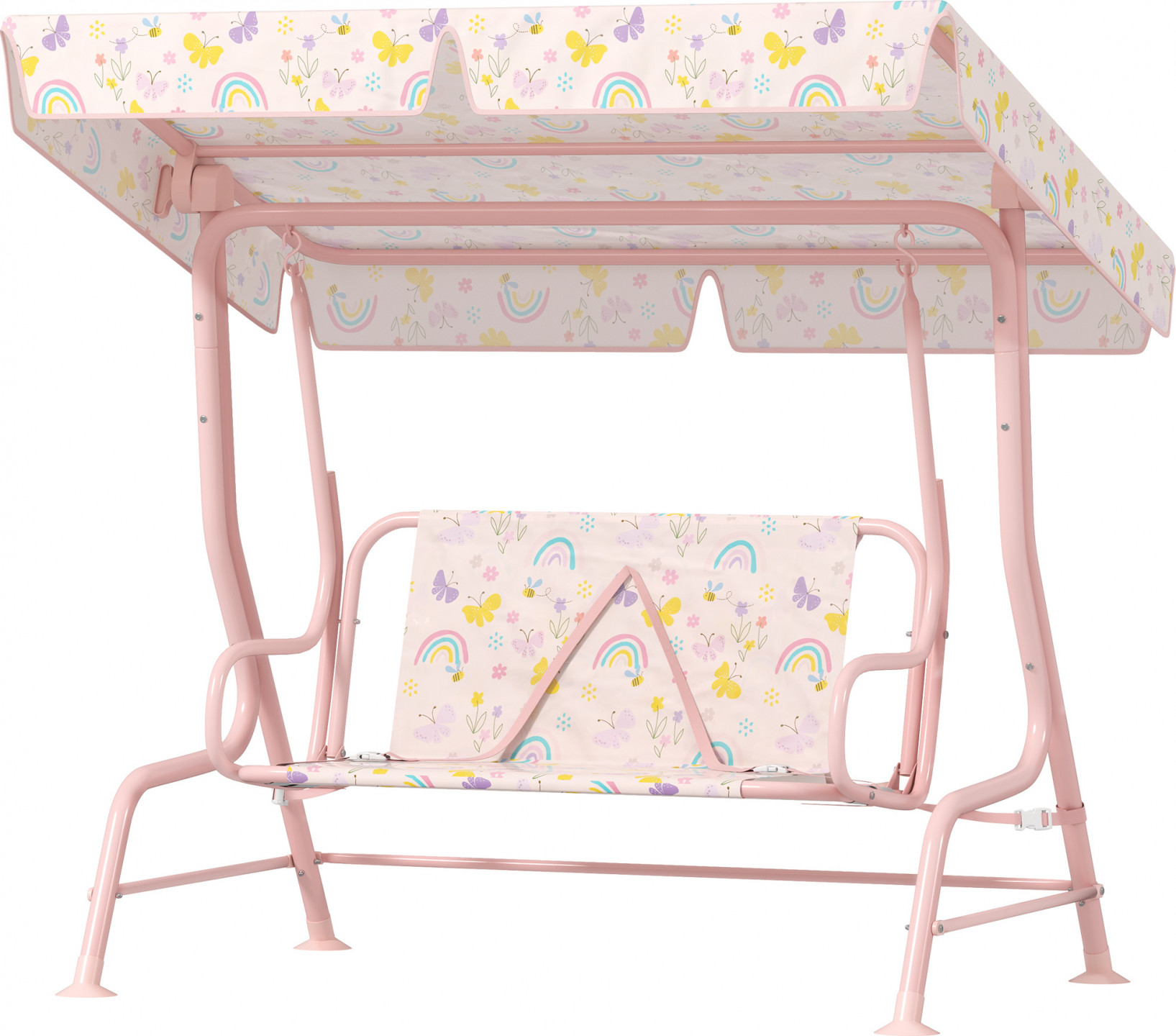 Má odnímatelnou, nastavitelnou stříšku proti slunci, která chrání vaše děti a je ideální na zahradu nebo k bazénu. Robustní ocelový rám s protiskluzovými nožičkami zajišťuje bezpečnost, zatímco rozkošný duhový design poskytuje zábavu.