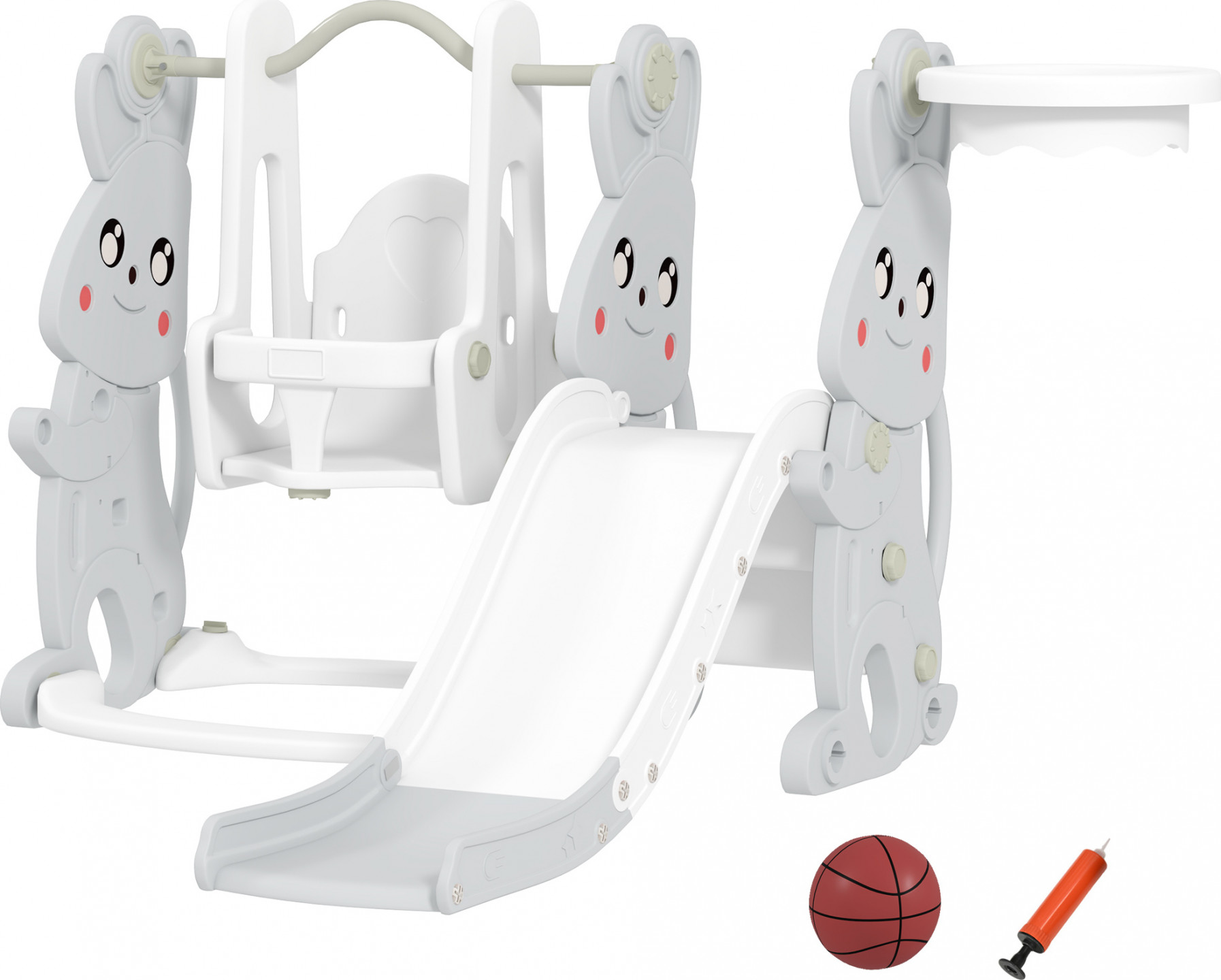 Proměňte svůj domov v kouzelné vnitřní hřiště se sadou houpaček a skluzavek pro batolata! Tato čtyřdílná sada obsahuje rozkošnou skluzavku s motivem zajíčka, houpačku, prolézačku a basketbalový koš. Segmentová skluzavka zajišťuje vyšší bezpečnost a bezproblémové používání. Stabilní zábradlí a robustní opěradlo na houpačce navíc zaručují bezpečnou a příjemnou hru pro batolata ve věku od 1,5 do 3 let.