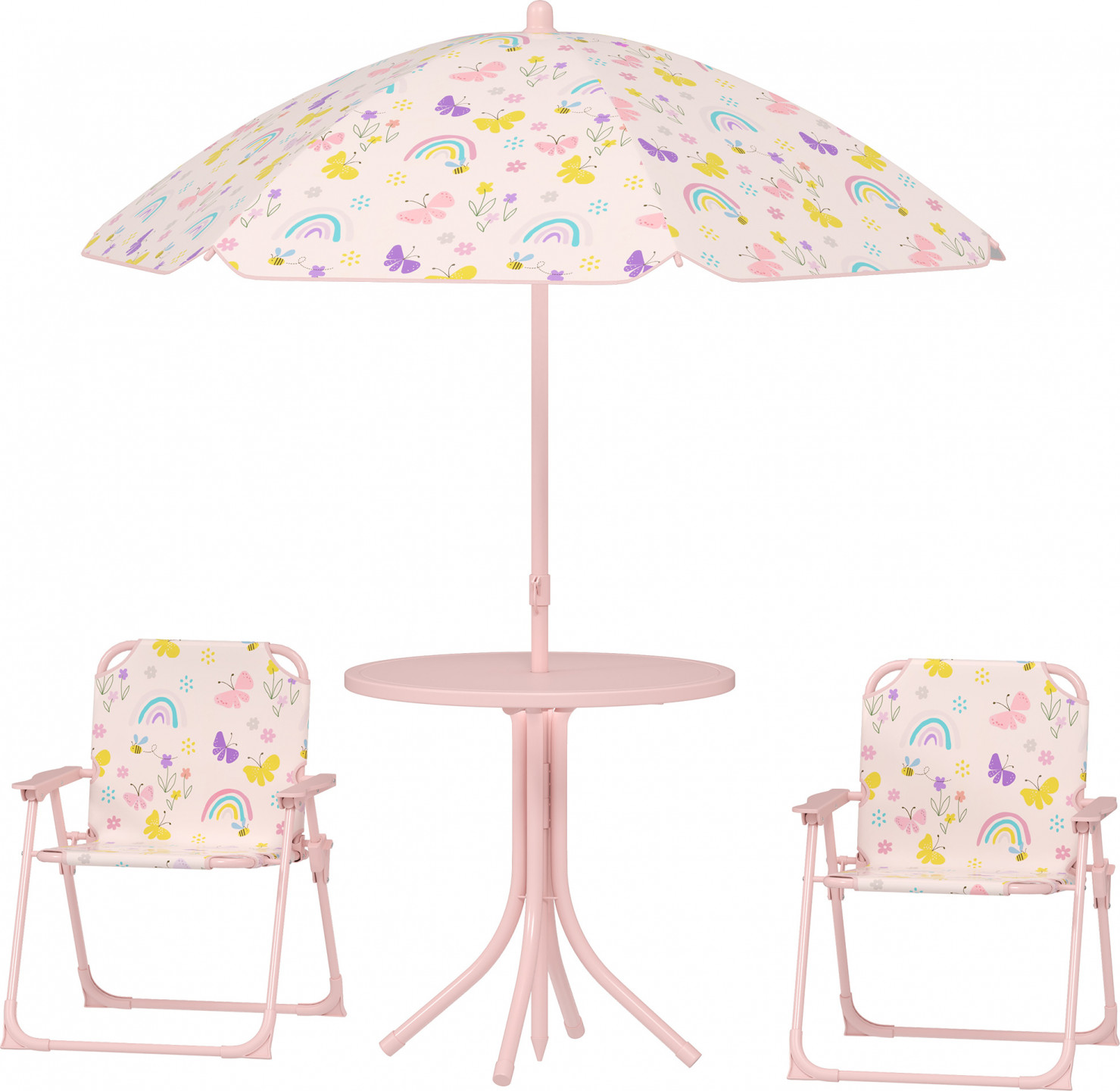 Proměňte svou zahradu pomocí dětského zahradního nábytku, který se skládá ze stolu a skládacích židlí s krásnými dětskými motivy. Součástí je nastavitelný slunečník pro zastínění. Vhodné pro děti ve věku 2-5 let, skládací pro snadné skladování.