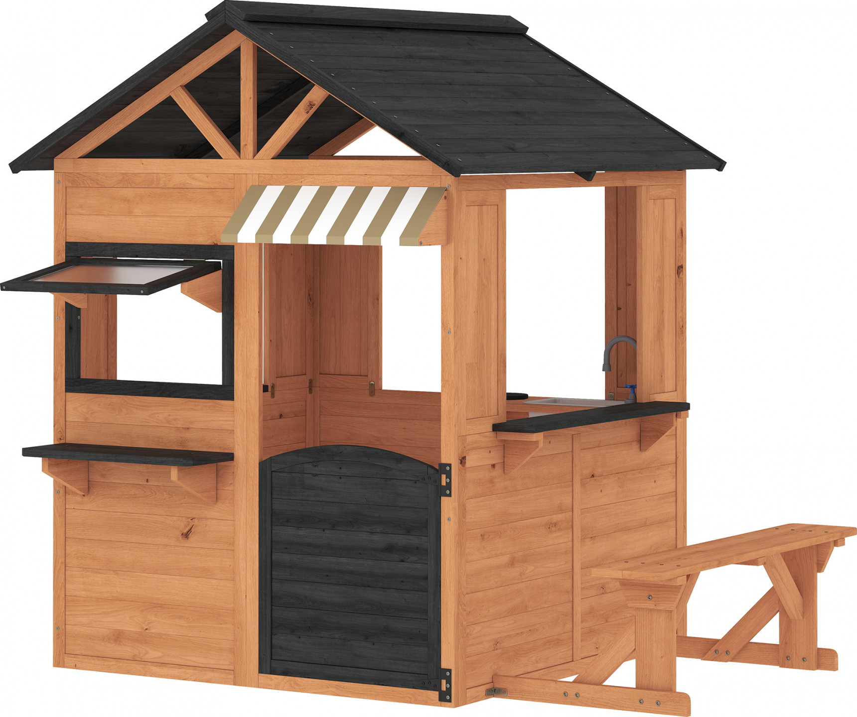 Venkovní dětský domeček promění vaši zahradu v kreativní hřiště. Je vyroben z robustního jedlového dřeva a nabízí bezpečný prostor pro hraní. Integrovaná kuchyňka vybízí ke kulinářským dobrodružstvím, zatímco servírovací plochy a lavička zvou kamarády ke společné hře. Tento hrací domek podporuje představivost a společenskou zábavu a vytváří nezapomenutelné vzpomínky na dlouhá léta. Snadno se sestavuje, je odolný a ideální pro každodenní zábavu v interiéru i exteriéru.
