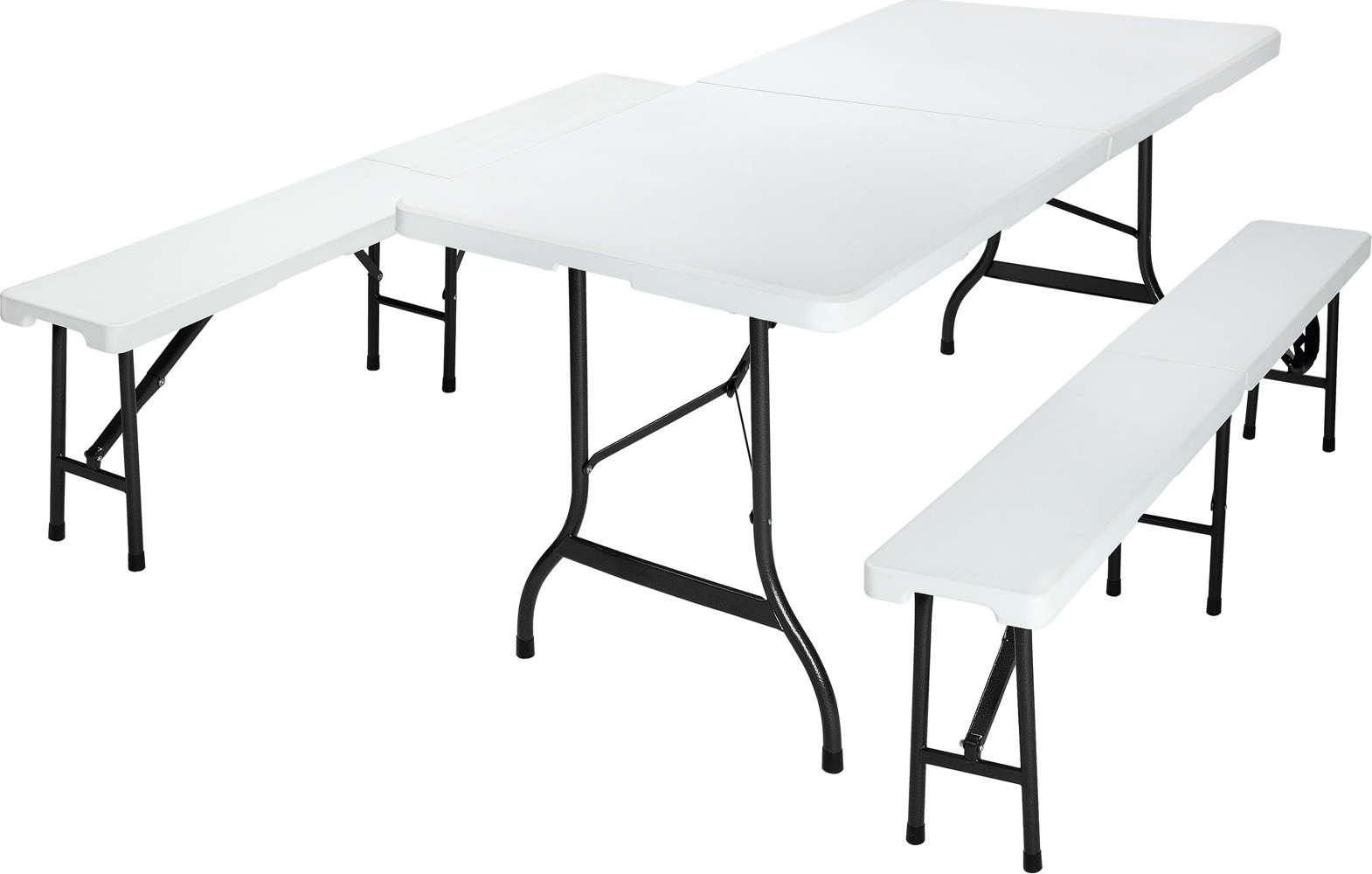 Tato snadno udržovatelná plastová sada pivních stanů vás zve k pohodlnému společnému posezení. Ať už se jedná o narozeniny, večírky, klubové oslavy nebo váš příští kempovací výlet , tato sedací souprava je skládací a rychle se sestavuje, když je málo místa a potřebujete rychlé a praktické řešení. Pivní stůl a lavice mají praktický skládací mechanismus uprostřed . Díky tomu lze sadu rychle a snadno složit na délku pouhých 91,5 cm a prostorově úsporně ji uložit až do dalšího použití . Díky bočním rukojetím , nízké hmotnosti a funkci kufru se sada vejde téměř do každého kufru a snadno se přepravuje. Aby se zabránilo poškrábání citlivých povrchů , jsou nohy stolu a lavic vybaveny chrániči podlahy, takže sestavu lze umístit i do interiéru.
