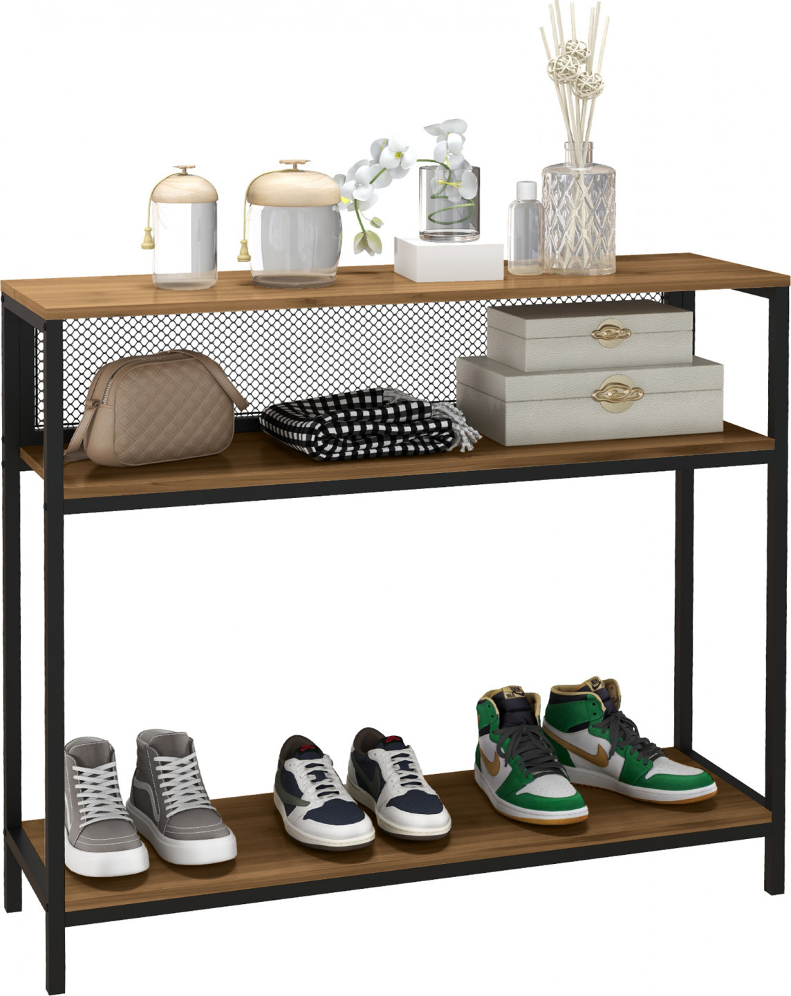 Hledáte úložný prostor a dekorativní doplněk pro svůj vstupní prostor? Konzola může být vítaným kusem nábytku, kde si můžete vystavit své oblíbené věci. Se 2 otevřenými přihrádkami pro uložení peněženky, klíčů a osobních věcí. Konzola je vyrobena z umělého dřeva a robustního kovu, který je spolehlivý a snadno se čistí. Provedení proti překlopení poskytuje dodatečnou stabilitu.