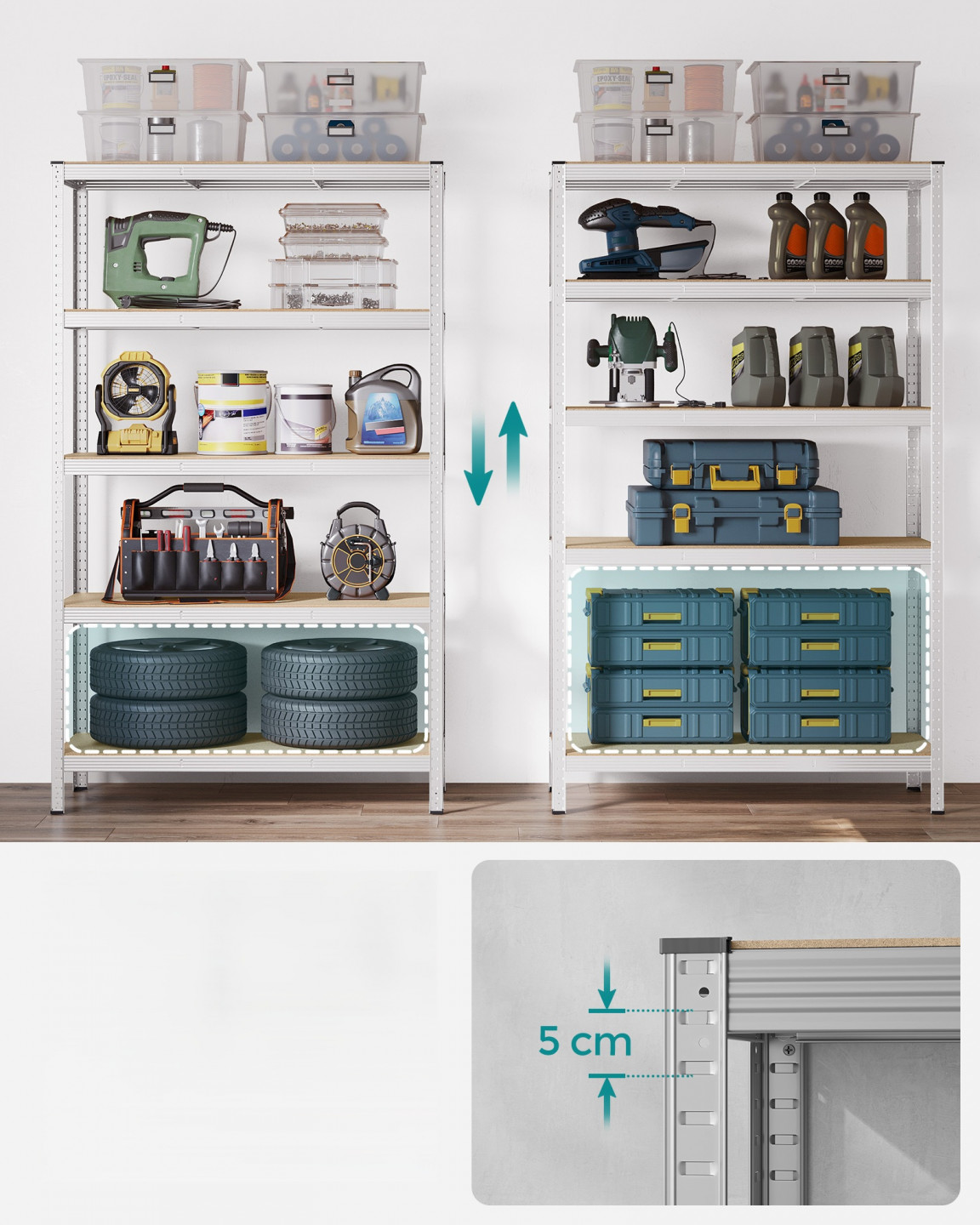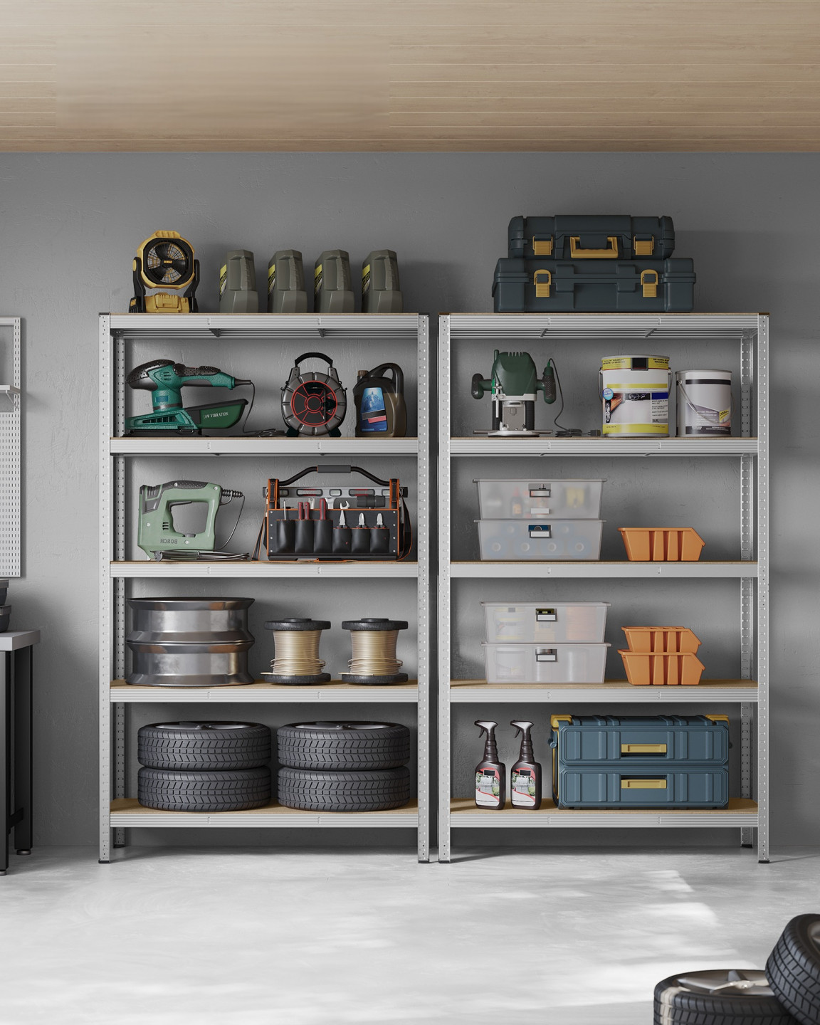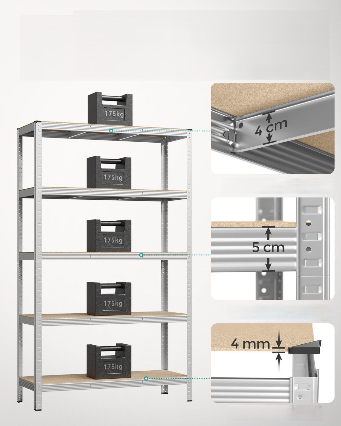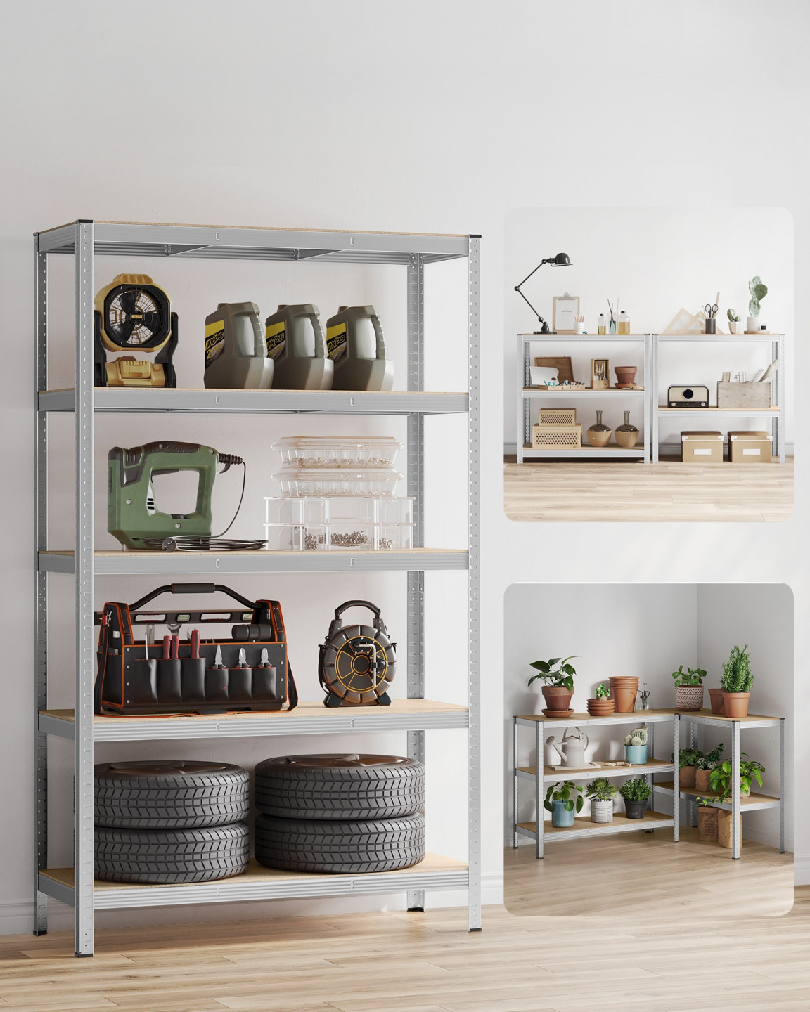 Tento garážový regál je vyroben z ocelového rámu a každá úroveň unese až 175 kg. Součástí dodávky je sada proti převrácení, která pomáhá připevnit regál ke zdi, čímž jej činí stabilnějším a bezpečnějším.