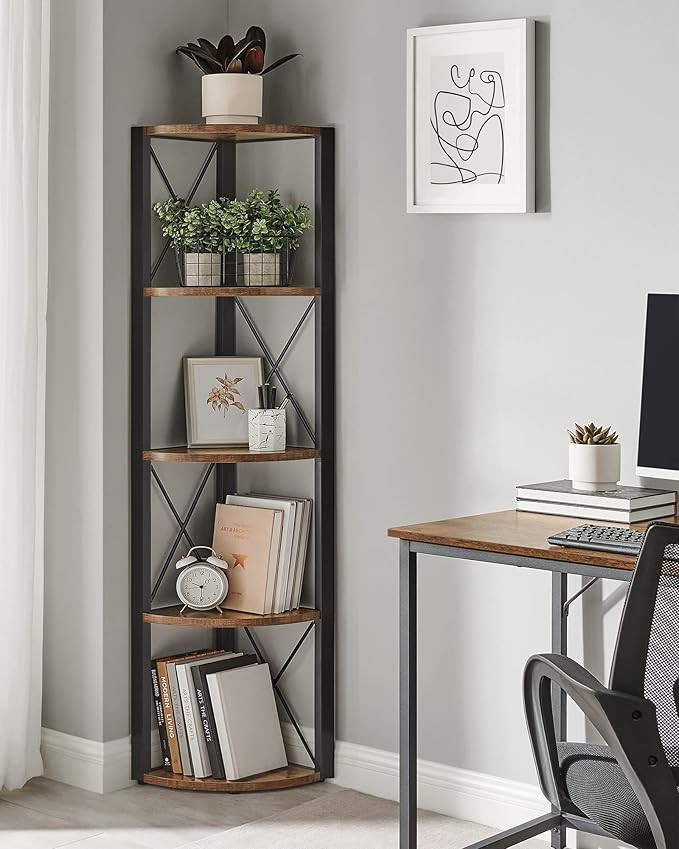 Tato rohová pětipatrová police je praktická a stylová úložná/vystavovací jednotka, která perfektně využije každý roh v místnosti bez zabírání cenného prostoru. Skvěle se hodí do obývacího pokoje, ložnice, kuchyně, pracovny nebo koupelny pro organizaci kombinace dekorací, knih, rostlin i každodenních předmětů.