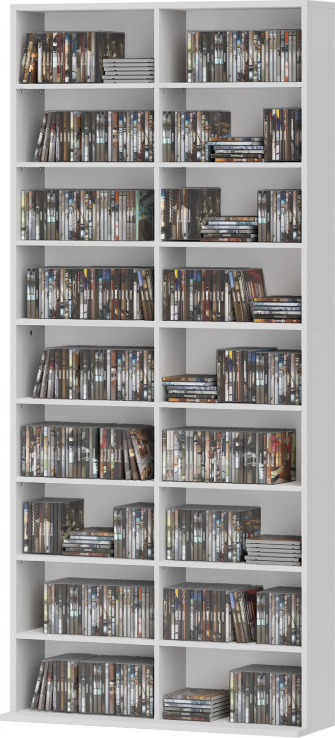 Chcete si uspořádat svou sbírku médií? Tento držák na CD nabízí 18 přihrádek a 14 přizpůsobitelných polic až pro 640 CD, 360 DVD nebo 430 Blu-ray disků. Moderní, prostorově úsporný design police na DVD se skvěle hodí do malých prostor a pevný rám s popruhem proti překlopení zajišťuje bezpečné uchycení. Hrdě vystavte své poklady při příchodu návštěv a najděte si vlastní systém, abyste pokaždé rychle vybrali ten správný disk.