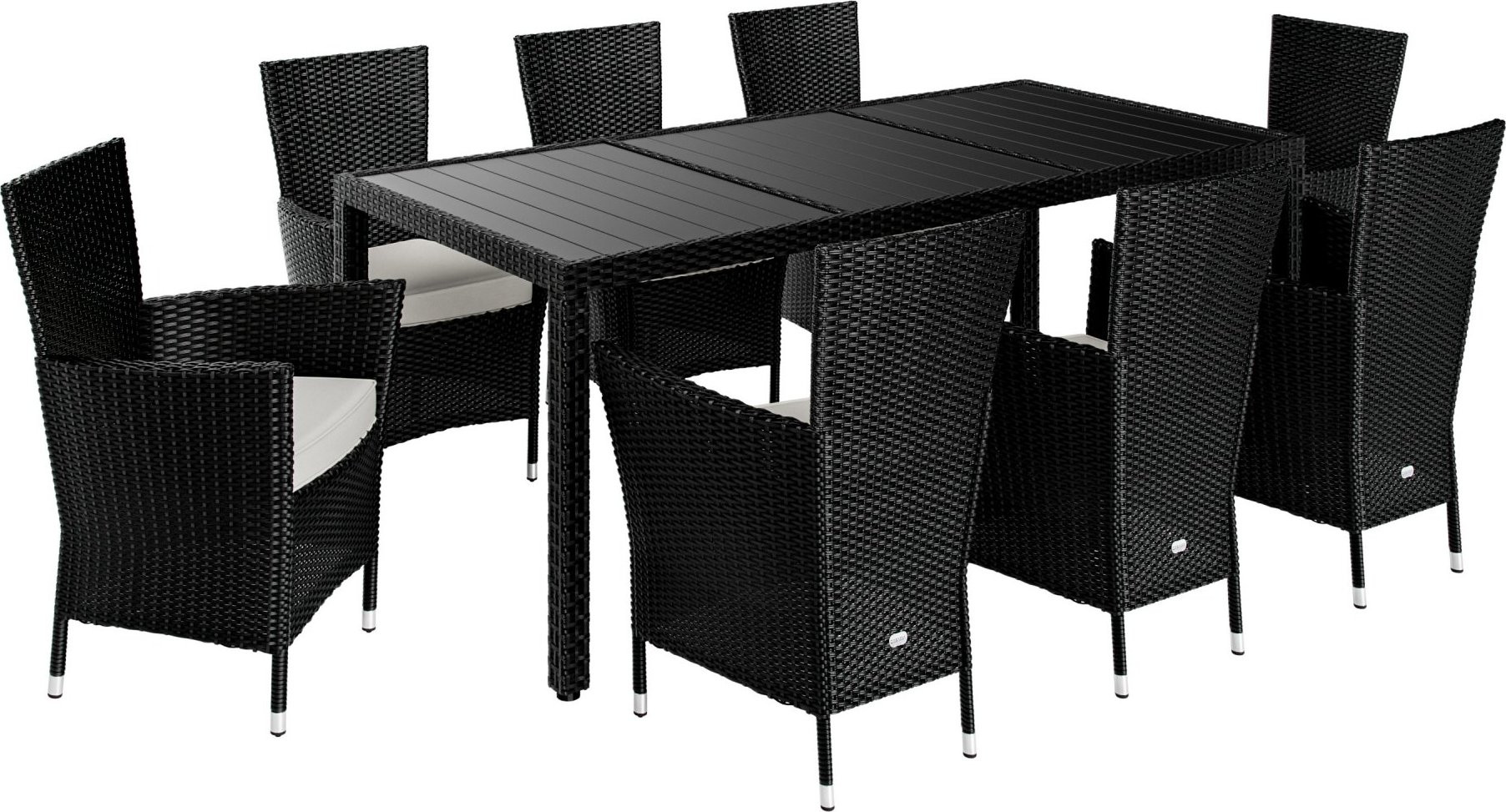 S 9dílnou polyratanovou sedací soupravou si můžete bez obav užít léto s přáteli a rodinou. Tato elegantní kombinace se skládá z 8 pohodlných židlí a stolu s deskou z WPC o rozměrech 190 x 90 x 75 cm. 7 cm silné polštáře vám zpříjemní sezení a v případě potřeby je lze prát na 30 °C.