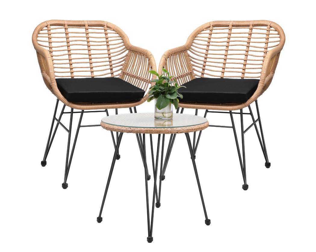 Urlaubsfeeling für Zuhause und ein Eyecatcher in jedem Raum! Das 3-teilige, handgewobene Balkonset Bali ist für den Innen- und Außenbereich geeignet. Die ergonomisch geformten Korbsessel und die pflegeleichten, 5 cm dicken Sitzkissen bieten höchsten Sitzkomfort. Das Set hat ein stabiles Gestell aus pulverbeschichtetem Stahl. Durch die Stellschrauben an Tisch und Stühlen kann die Sitzgruppe den jeweiligen Bodenunebenheiten individuell angepasst werden. Der Tisch hat eine robuste, 5 mm starke Platte aus Sicherheitsglas. Die wasserabweisenden und UV-lichtbeständigen Auflagen sind sehr pflegeleicht und können bei Verschmutzung einfach bei 30° gewaschen werden. Produktvorteile: * strapazierfähiges, UV-lichtbeständiges Polyrattan * In- und Outdoor geeignet * Bodenausgleichschrauben * bei 30° waschbare Sitzkissen * standfester und stabiler Stahlrahmen * 5 mm starke Tischplatte aus Sicherheitsglas * ergonomisch geformte Korbsessel mit hohem Sitzkomfort * stilvolles Vintage Design * einfache Montage Technische Daten: * Maße Tisch (ØxH): 53 x 55 cm * Maße Glasplatte (H): 5 mm * Maße Sessel (LxBxH): 59 x 56 x 80 cm * Sitzhöhe: 43 cm * Maße Sitzkissen (H): 5 cm * Gewicht Tisch: 5,8 kg * Gewicht Sessel: 5,8 kg * Belastbarkeit: 120 kg * Material Rahmen: Stahl pulverbeschichtet, galvanisiert * Material Korbsessel: Bambus Polyrattan * Material Bezug Sitzkissen: 100% Polyester * Material Füllung Sitzkissen: 100% Polyurethan * Farbe: Naturfarben / Schwarz Lieferumfang: * 1 x Tisch Bali * 2 x Korbsessel Bali * Montagematerial * Aufbauanleitung