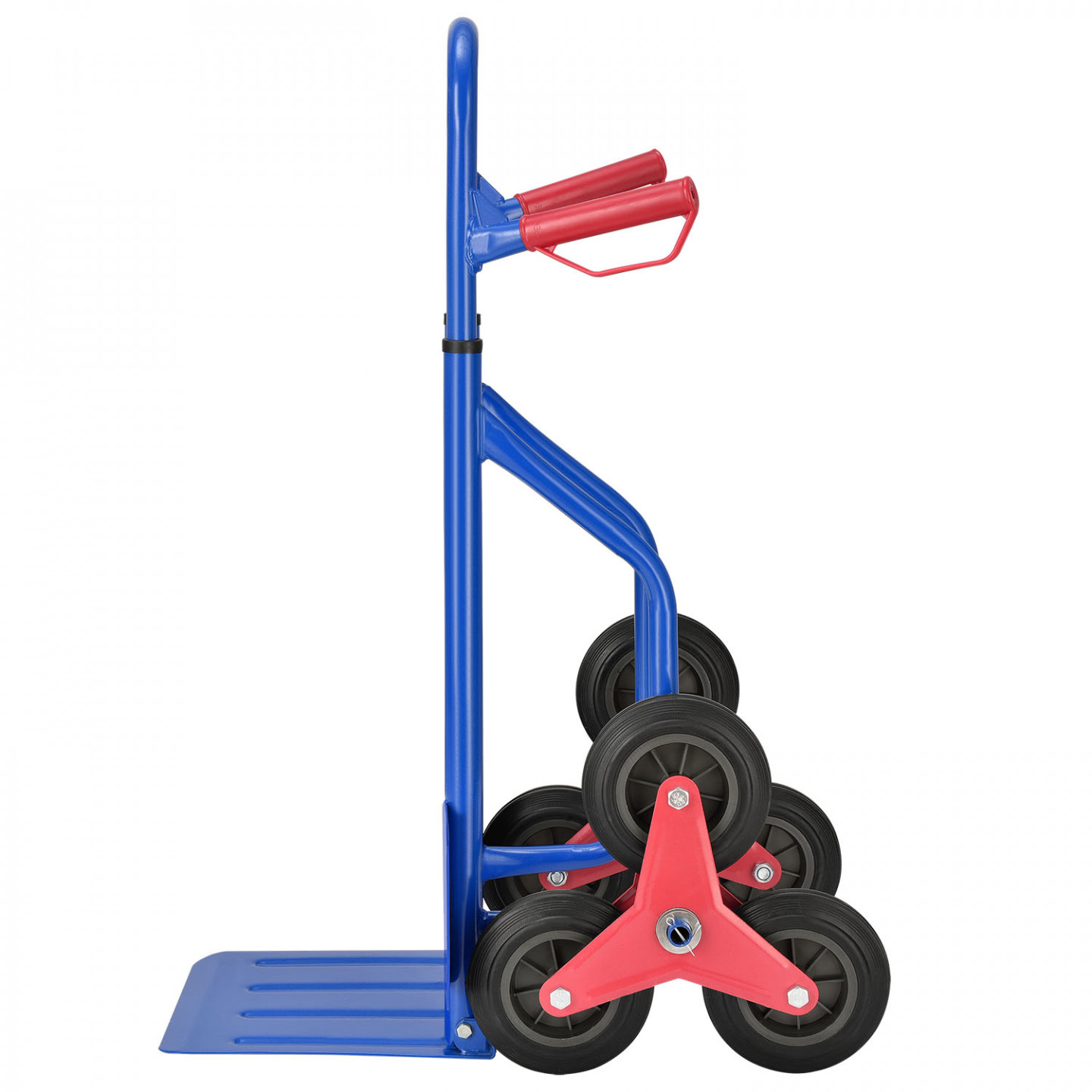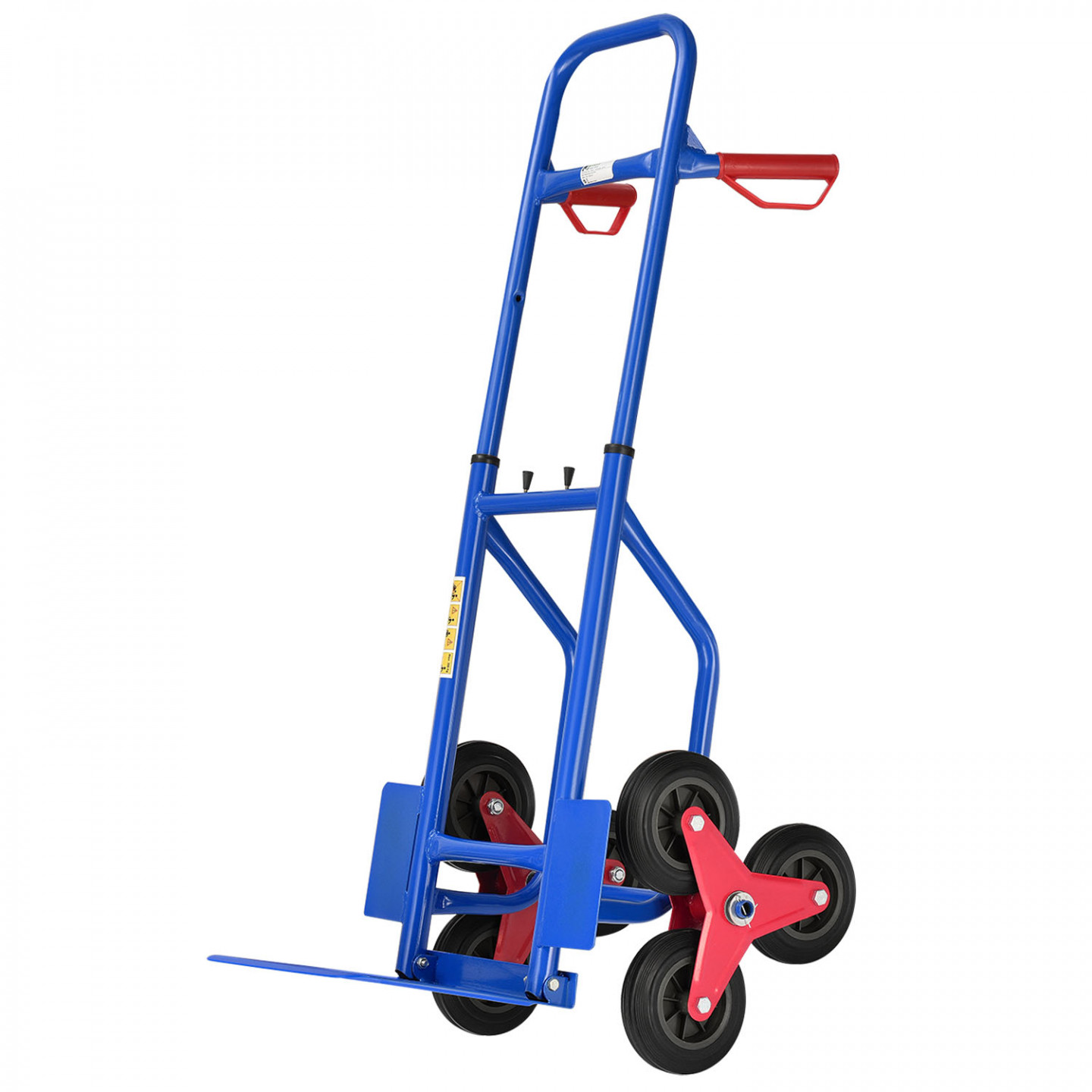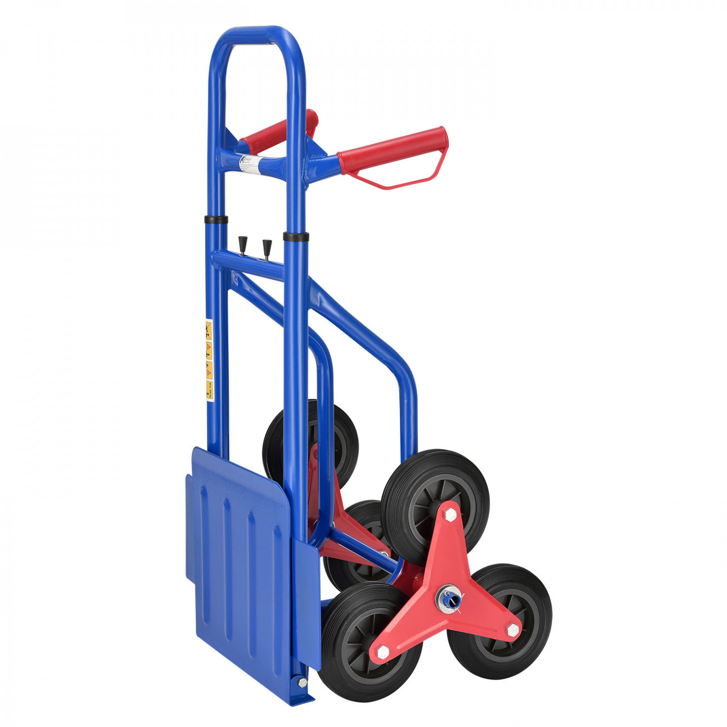 Manipulačný vozík so stabilnou práškovo lakovanou oceľovou konštrukciou, šiestimi kolieskami a bezpečnostnými madlami na jednoduchú manipuláciu s nadrozmerným a ťažkým tovarom na schodisku.