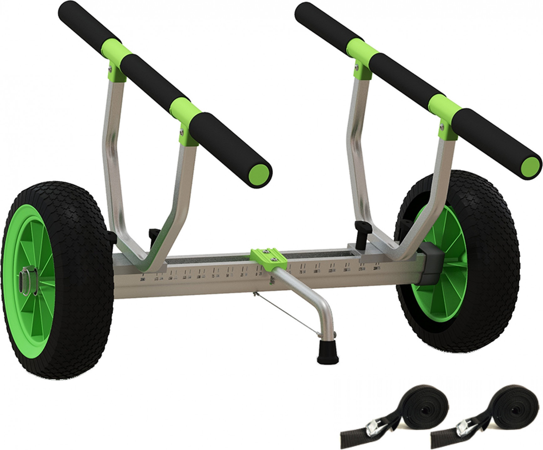 Usnadněte si život s tímto vozíkem na loď. Hliníkový rám tohoto kajakového vozíku se dvěma velkými pneumatikami a kvalitní, ale přesto lehkou konstrukcí umožňuje snadný pohyb po jakémkoli povrchu, od písečných pláží až po travnaté břehy. Díky nastavitelné šířce není problém přepravovat lodě různých velikostí. Další pádlovací dobrodružství tak může začít!