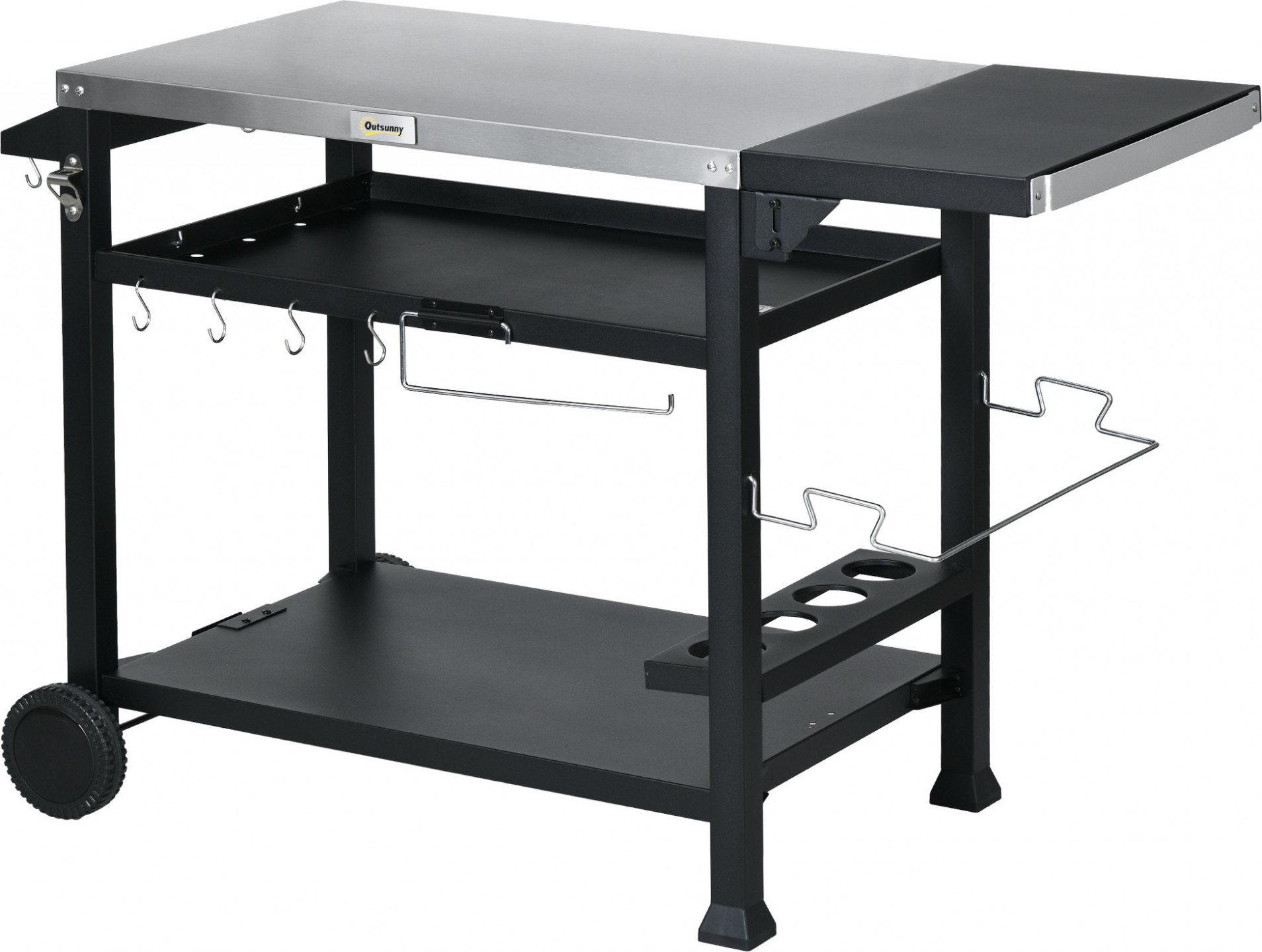 Tento grilovací vozík je ideálním partnerem pro zábavu při grilování: je multifunkční a praktický. Tato všestranná venkovní grilovací stanice nabízí nespočet možností a skutečně mění pravidla hry. Je vybaven 6 háčky, háčkem pro uchycení nádrže, držákem na ručníky, otvírákem na láhve, stojanem na víno, stojanem na koření, držákem na pytle na odpadky a 2 policemi. Díky této grilovací stanici se venkovní grilování stane skutečným potěšením.