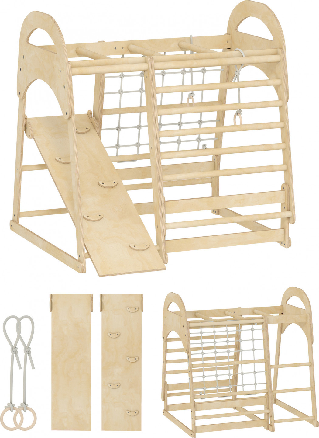 - Prolézačka 6 v 1 s žebříkem, sítí, kruhy a skluzavkou pro skvělou zábavu při hře v interiéru.