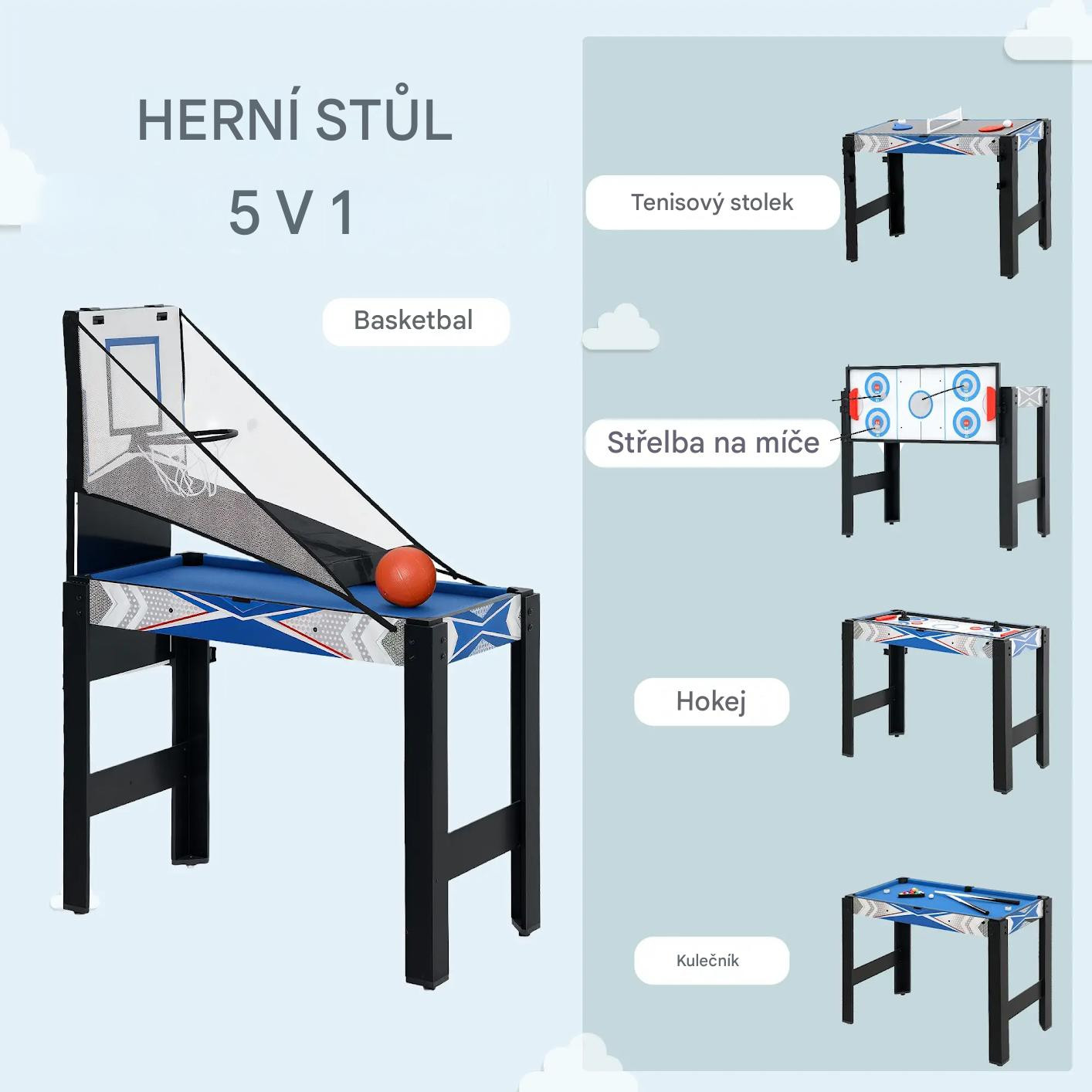 Zábava pro celou rodinu na jednom místě! Tento multiherní stůl 5 v 1 nabízí širokou škálu oblíbených her v kompaktním provedení a moderním modro-černém designu. Ideální pro dětské pokoje, herny i menší prostory, kde chcete maximálně využít každé místo.