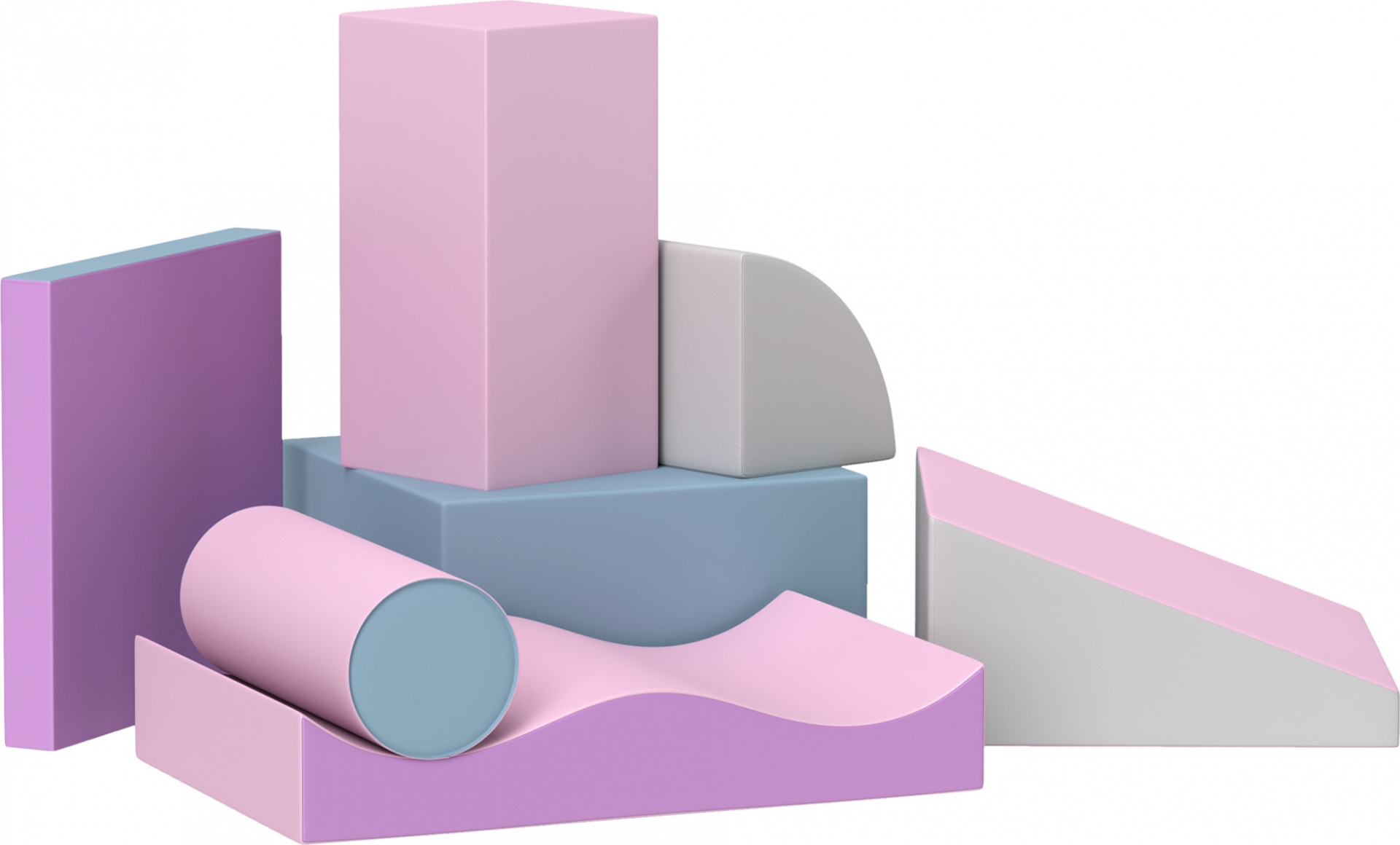 - Sada měkkých stavebních bloků obsahuje tři krychle, rampu, vlnový prvek, čtvrtválce a válec