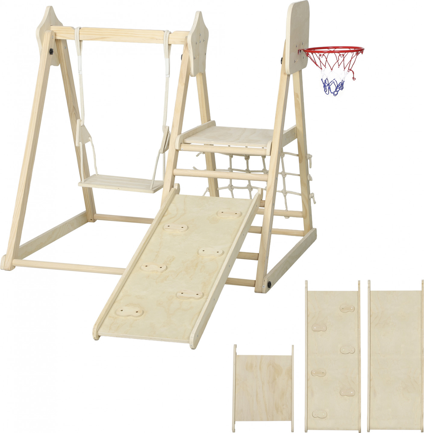 - Prolézačka 5 v 1 s houpačkou, skluzavkou a košem pro všestrannou zábavu v interiéru.