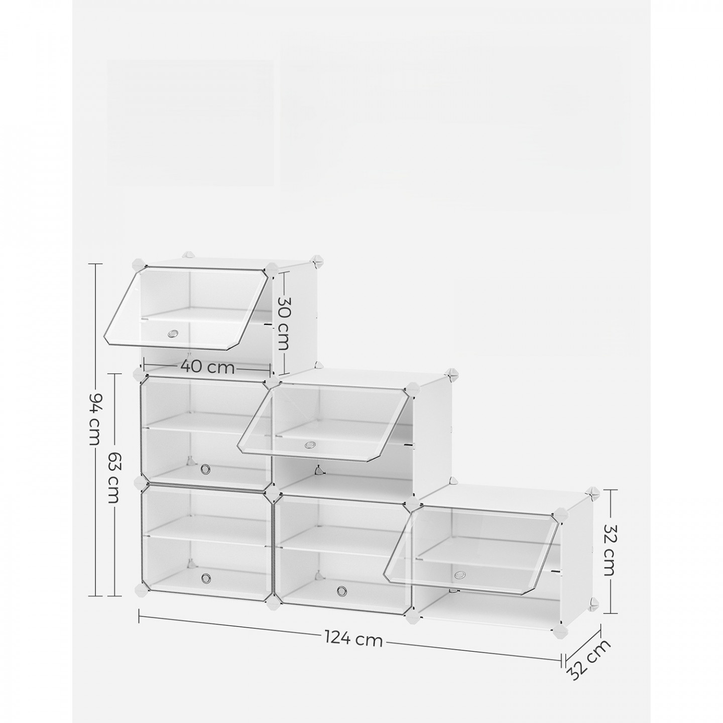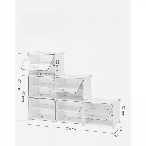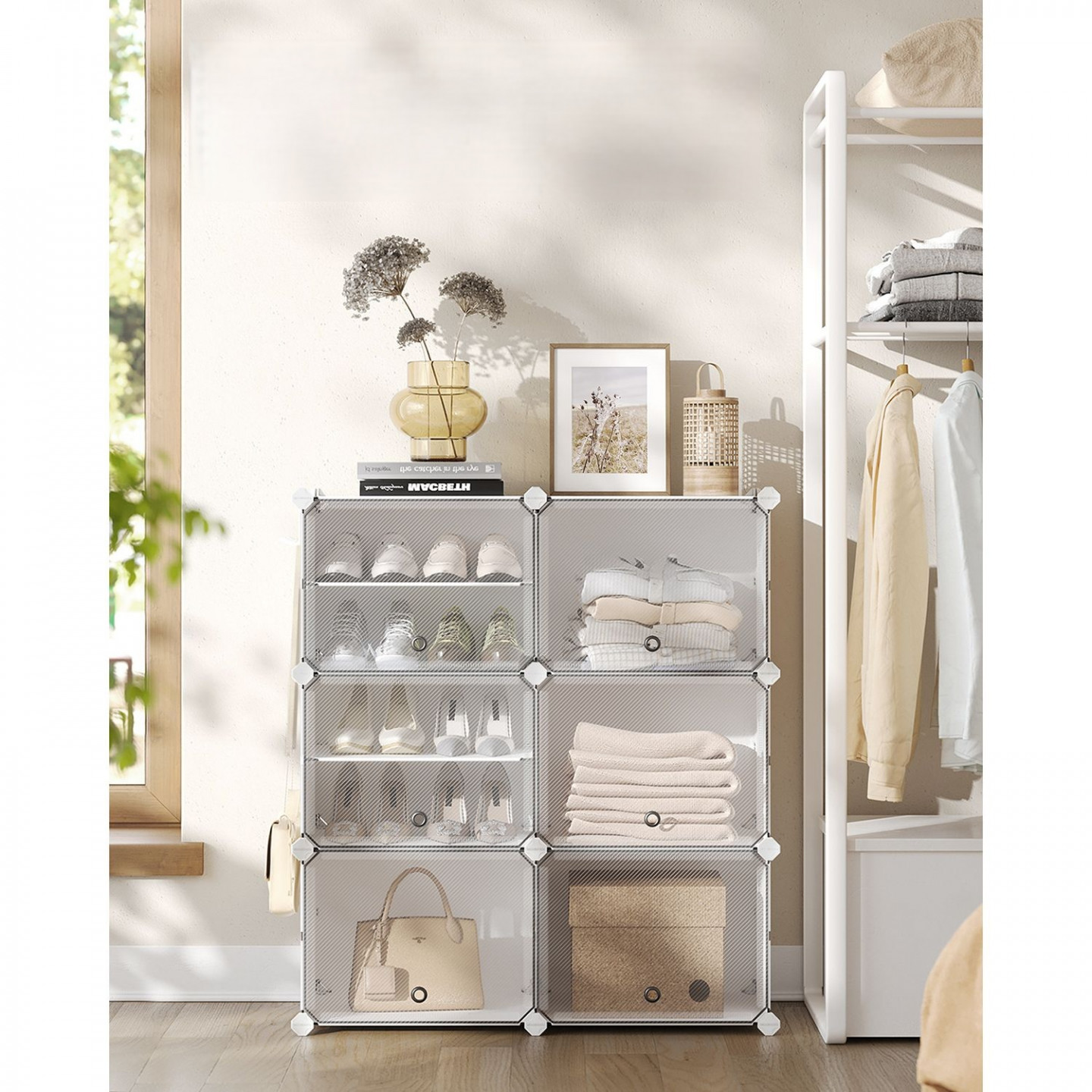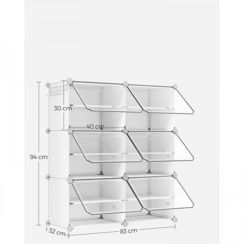 Tento plastový organizér na boty, který pojme až 24 párů bot, lze také použít k uložení tašek a oblečení. Díky prostorově úsporným bočním hákům je vhodným způsobem pro zavěšení klobouků nebo vodítek pro psy