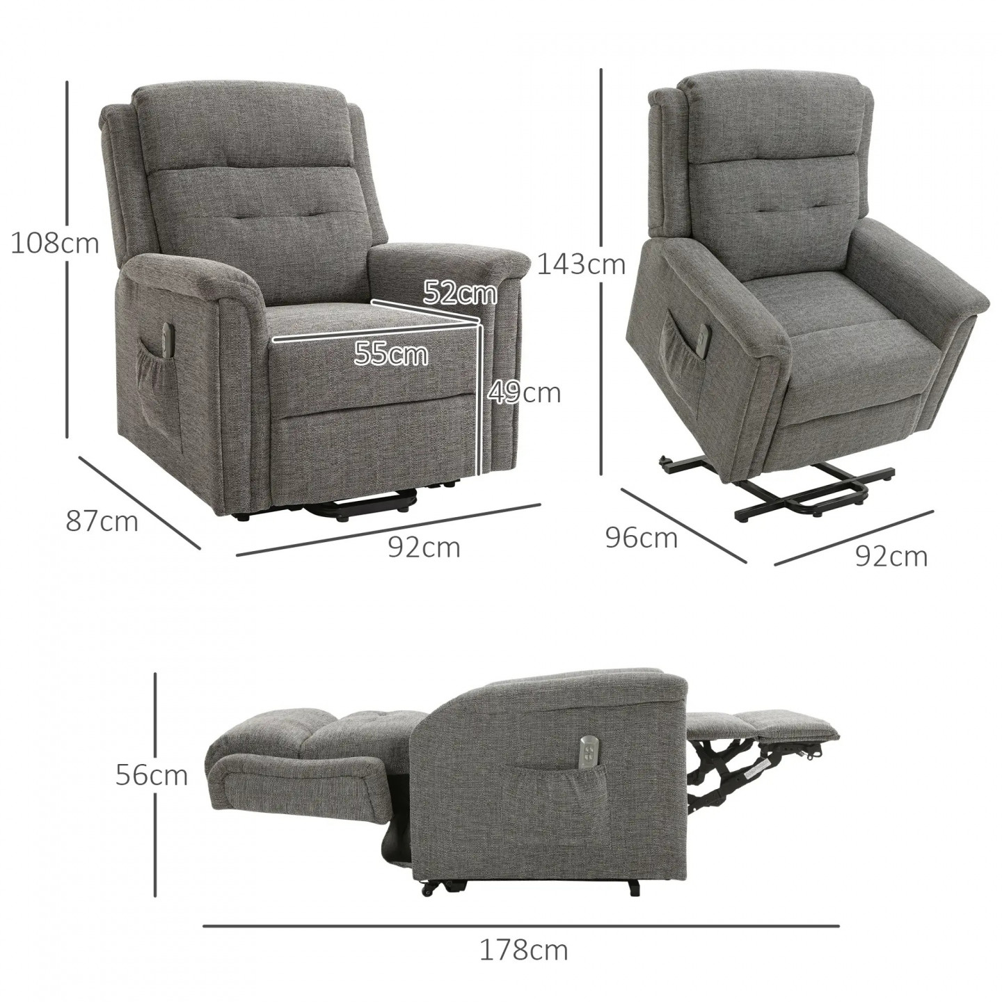 Díky funkci naklopení Vám toto křeslo pomůže vstát a sednout si. Praktické boční kapsy poskytují úložný prostor pro dálkové ovladače a časopisy. Opěradlo lze naklonit až o 180° a lze jej také uvést do polohy ležmo. V tomto křesle můžete pohodlně sledovat televizi, relaxovat a odpočívat. Vestavěná opěrka nohou nabízí další pohodlí.