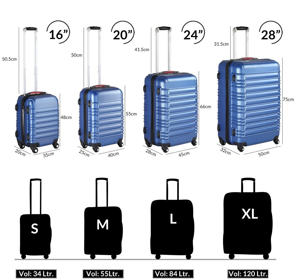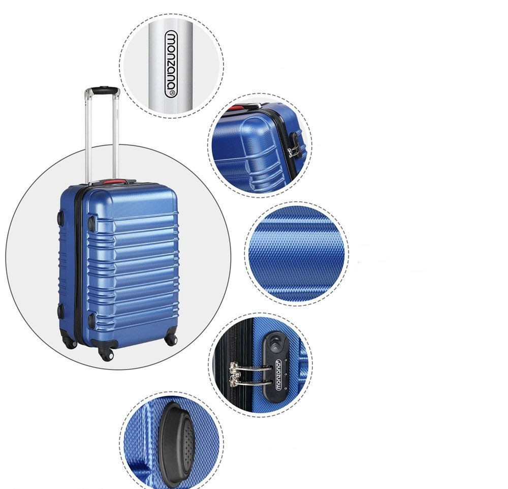 Naše ultraľahké cestovné kufre v modernom dizajne sú dokonalým spoločníkom na vašej dovolenke. Pevná škrupina z ABS, praktické funkcie a bohaté príslušenstvo sú výhodami týchto škrupinových cestovných kufrov. Hliníková teleskopická rukoväť, štyri pogumované kolieska s možnosťou otáčania o 360° a dve bočné rukoväte vám uľahčia cestovanie. Škrupina z ABS má krásnu modrú povrchovú úpravu a je veľmi odolná voči otrasom a nárazom, ku ktorým dochádza napríklad na letiskách. Táto súprava kufrov je vhodná na výlety, krátke dovolenky, ale aj na dlhšie cesty.
