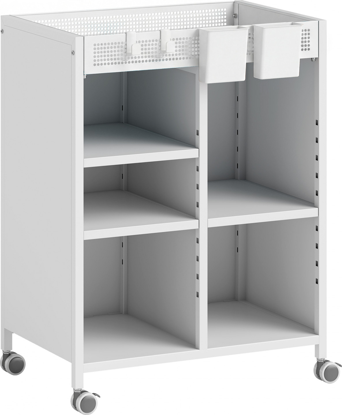 Působí váš pracovní prostor strnule a nepřehledně? S touto pojízdnou knihovnou budete mít své nezbytnosti po ruce, i když se budete pohybovat mezi pracovnou a obývacím pokojem. Tři nastavitelné police a připojitelné koše nabízejí systém organizace na míru. Uzamykatelná kolečka vozíku na knihy zajišťují stabilitu a praktické místo všude tam, kde chcete pracovat.