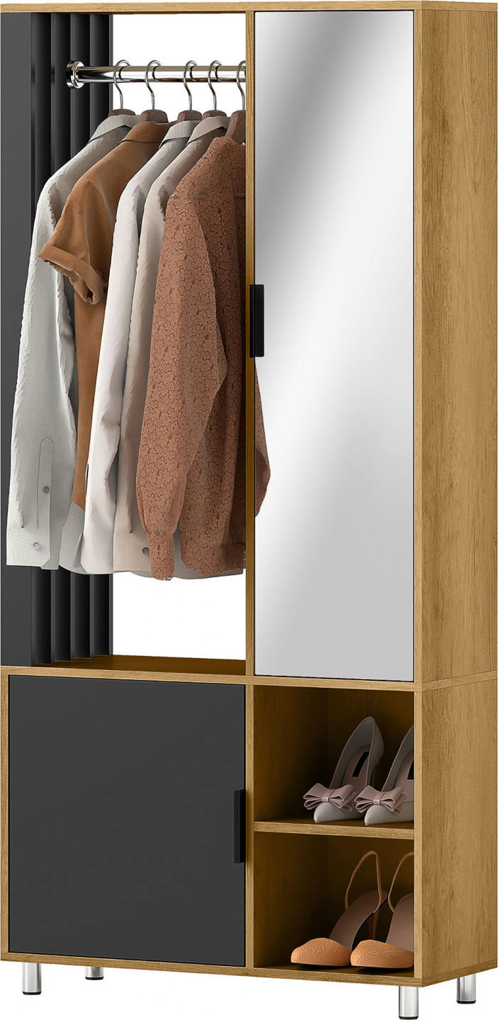 Vyzkoušejte moderní šatní soupravu, která spojuje eleganci s funkčností. Těšte se na otevřené úložné řešení předsíňové skříně s množstvím věšákových prostor a přihrádek na boty, vše na dosah ruky. Díky proskleným a obloženým dveřím zůstane složené oblečení bez prachu a v zrcadle po celé délce si můžete zkontrolovat svůj outfit od hlavy až k patě.