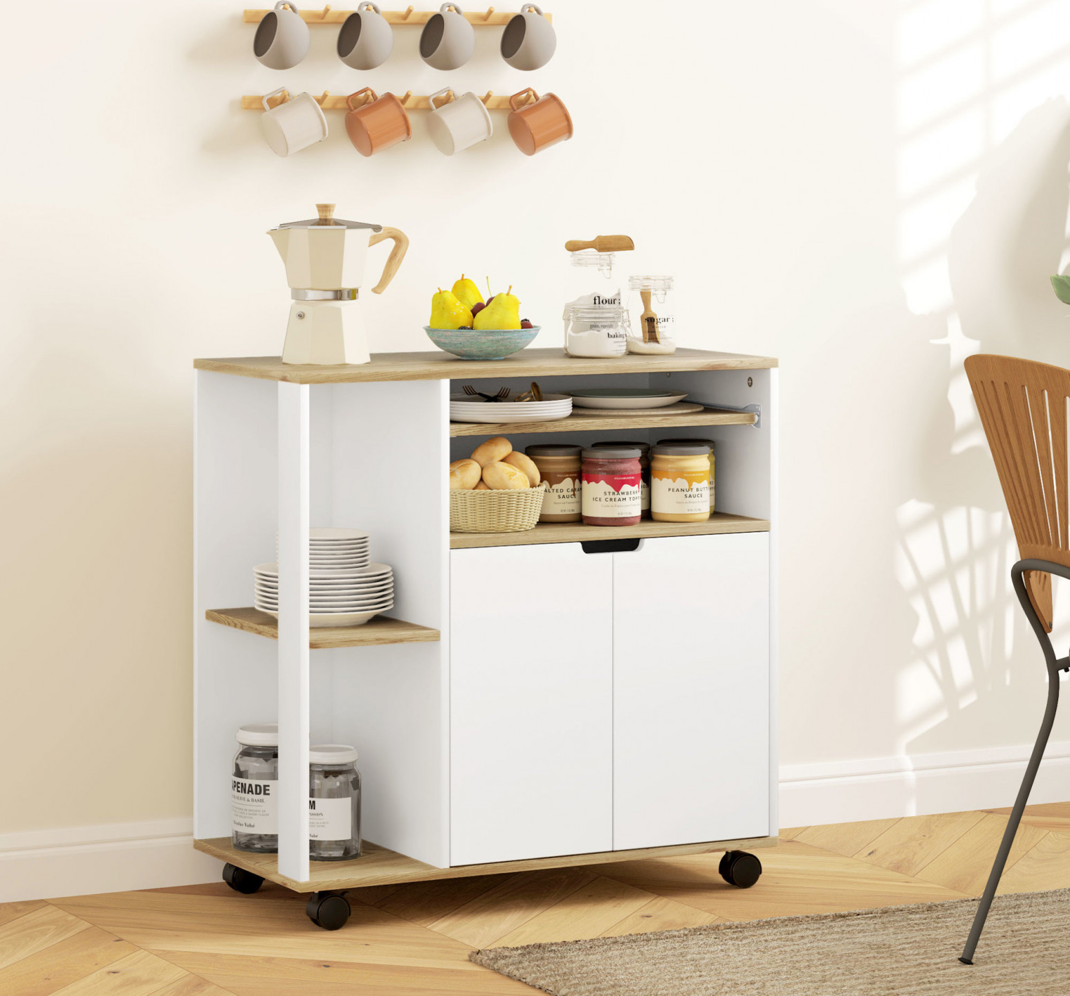 Optimalizujte svou domácnost s kuchyňským vozíkem! Různé možnosti ukládání usnadňují přípravu a servírování jídel. Obsahuje prostornou pracovní plochu pro přípravu pokrmů a výsuvnou polici na krájecí prkénka, pečicí papír a fólii. Koření lze přehledně uložit na malých bočních policích. Skříňka kuchyňského vozíku s dvojitými dveřmi a nastavitelnou vnitřní policí nabízí také flexibilní úložný prostor pro hrnce a pánve.