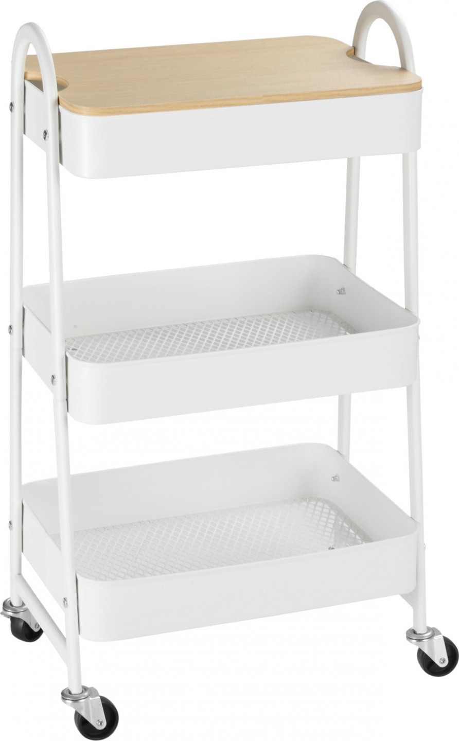 Tento praktický vozík se zásuvkami je kompaktní a ideální pro malé místnosti, které potřebují trochu více úložného prostoru. Tři prostorné police s koši nabízejí dostatek místa pro zásoby a příslušenství. Díky kolečkům s plynulým pojezdem a dvěma praktickým úchytům můžete servírovací vozík kdykoli bez námahy přemístit tam, kde je nejvíce potřeba. Jednoduchý, moderní design a elegantní barevné provedení se hodí do každého domácího interiéru.
