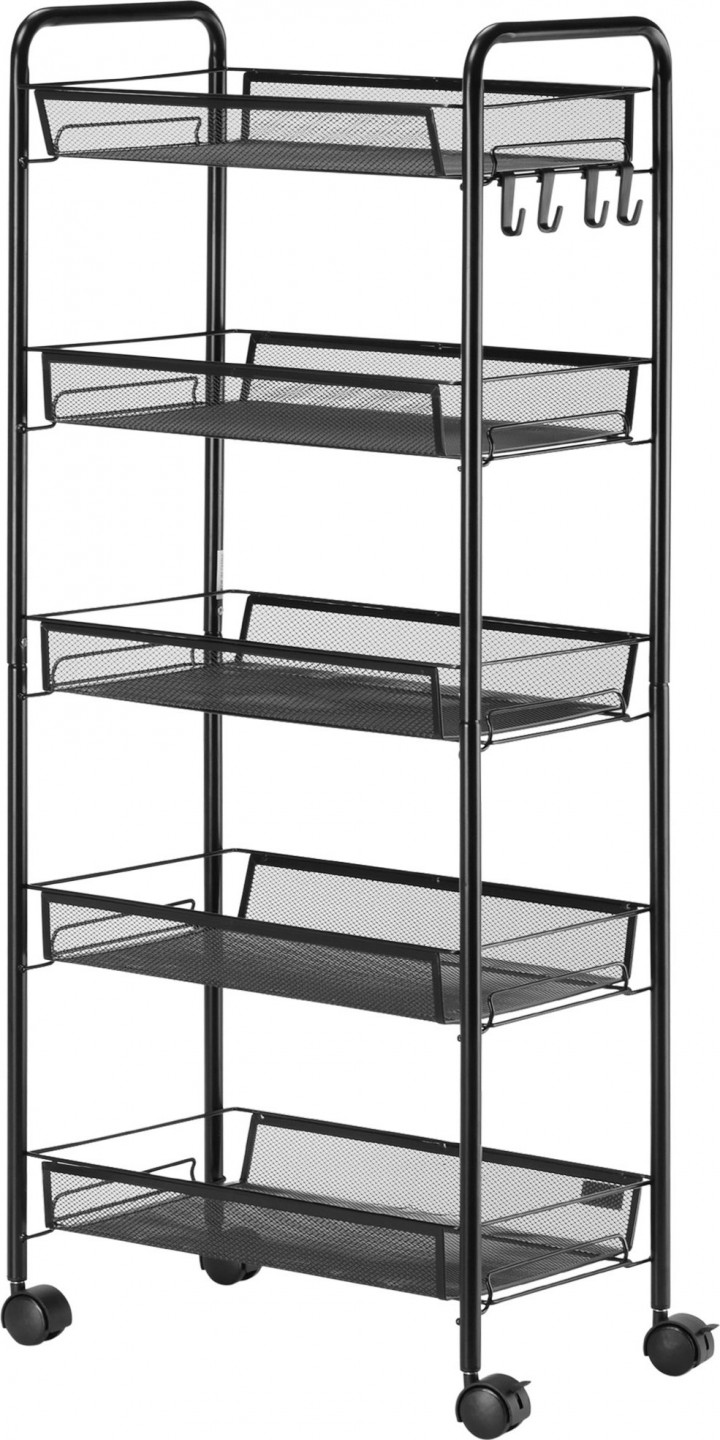 Kompaktní vozík je ideální pro menší místnosti, kde je potřeba další úložný prostor. Pětiúrovňová police kuchyňského vozíku nabízí dostatek prostoru pro příslušenství a náčiní. Díky dvěma hladce se pohybujícím rukojetím lze s vozíkem do niky bez námahy manévrovat a díky kolečkům jej lze posunout přesně tam, kam je potřeba.