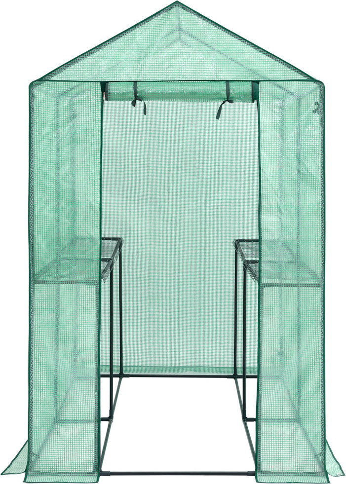 Robustní skleník nabízí dostatek prostoru pro vaše rostliny. Skleník lze také využít k pěstování různé zeleniny a bylin. Chraňte své křehké rostliny, květiny nebo zeleninu před větrem, deštěm, mrazem a hmyzem. Praktický systém zásuvných konektorů umožňuje rychlou montáž bez použití nářadí. Fólie vždy propustí dostatek slunečního světla a zároveň udrží vlhkost a teplo. Pokud se příliš zahřeje, jednoduše rozepněte zip na dvířkách a srolujte je. Tím zajistíte ideální cirkulaci vzduchu .Uvnitř se nacházejí dvě police bez zásuvek, každá se dvěma poličkami, které nabízejí dostatek prostoru pro rostliny. Police unesou až 10 kg . Spodní okraj krytu je o něco delší než rám. Doporučujeme okraj krytu zatížit zeminou nebo kameny pro zvýšení celkové stability. Pro optimální upevnění jsou součástí balení šňůry a zemní kotvy pro zajištění skleníku.