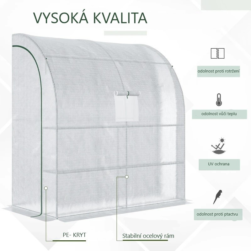 Skleník je nevyhnutnosťou pre všetkých hobby záhradkárov. Môžete v ňom zasiať semená zeleniny alebo pestovať kvety. Vďaka PE krytu sú vaše rastliny chránené pred poveternostnými vplyvmi, ale stále majú dostatok slnečného svetla, aby mohli rásť a prosperovať. Skleník má dvoje dverí a jedno okno. Je vybavený štyrmi policami.