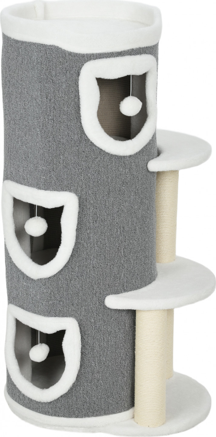 Nemohou si všechny vaše kočky najít útulné místečko u vás doma? Věž pro kočky nabízí vertikální řešení: díky třem soukromým útočištím a hrací zóně má každé zvíře své vlastní bezpečné místo, kde může harmonicky odpočívat a hrát si.