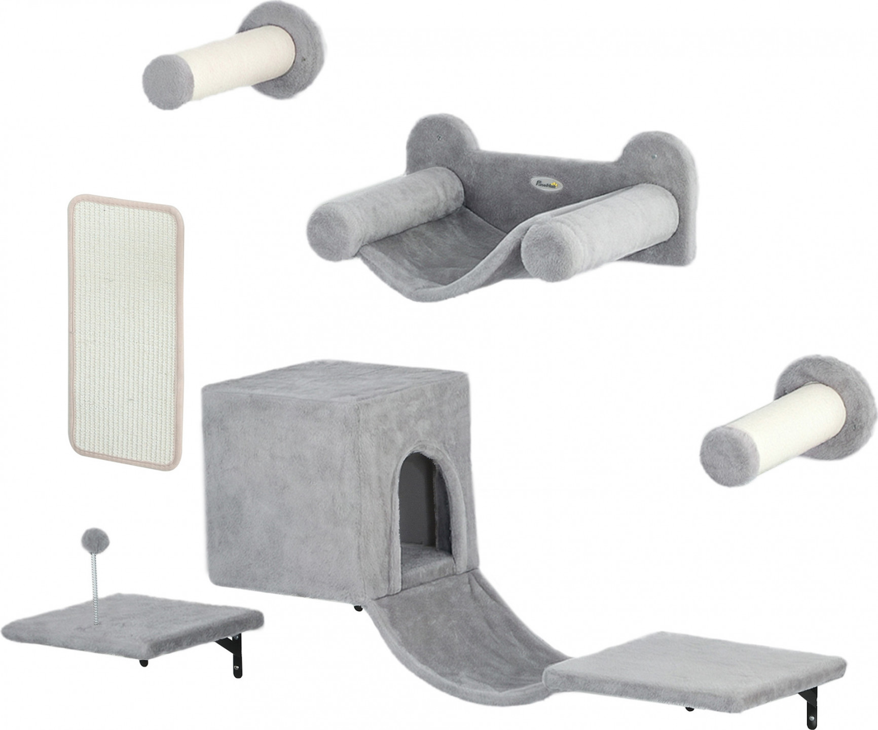 - Šestidílná sada kočičí stěny na prolézání obsahuje kondom, houpací síť, schůdky, plochu na ležení a škrábací desku