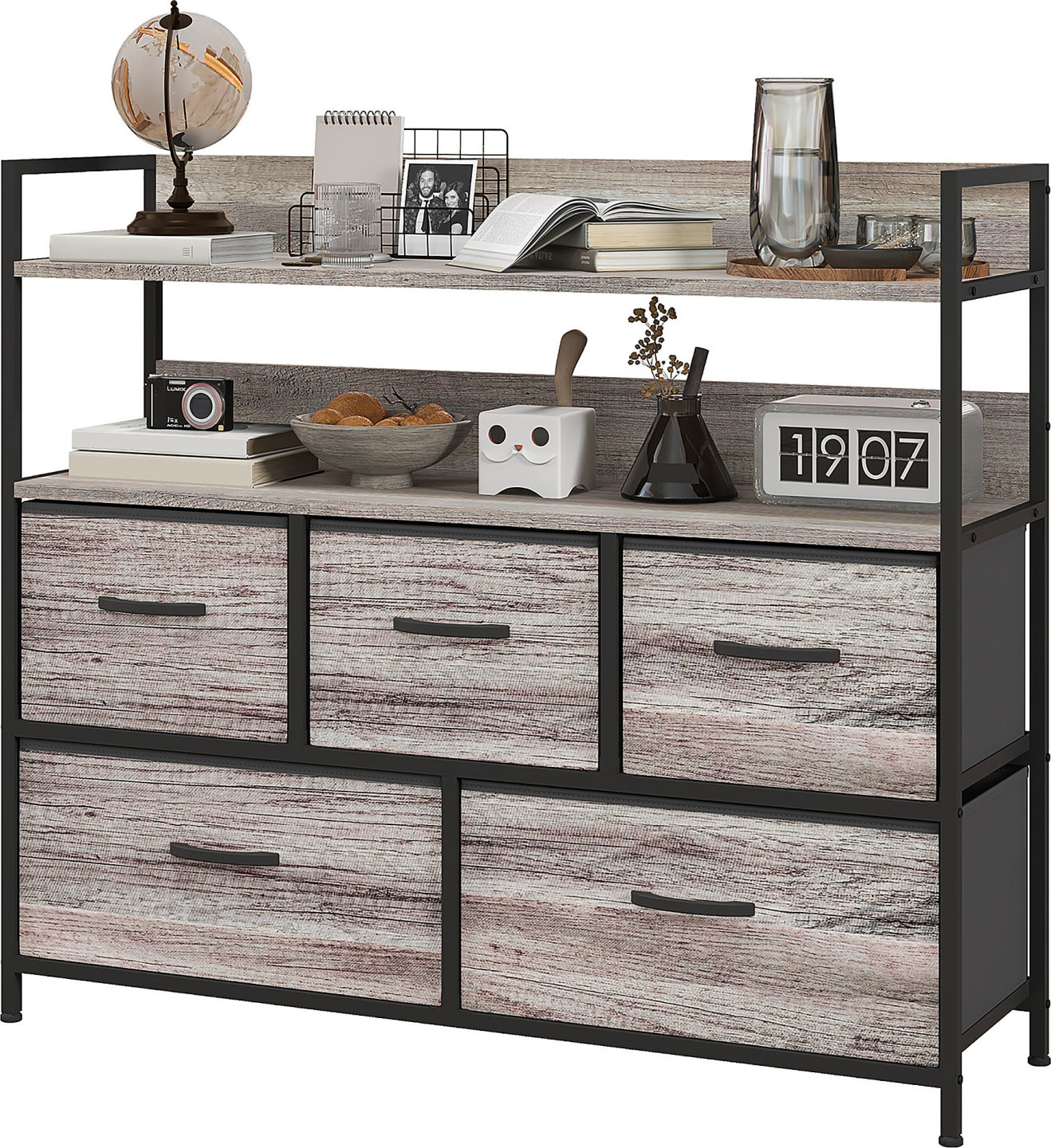 Tato prostorná komoda nabízí snadný způsob ukládání oblečení. Její industriální design ve vzhledu dřeva se hodí k mnoha stylům interiérů, je minimalistická a flexibilní. Je vybavena pěti zásuvkami, které pomáhají přehledně uspořádat různé kusy oblečení. Práškově lakovaný ocelový rám předsíňové skříně zajišťuje stabilitu a je vybaven nastavitelnými nožičkami pro vyvážené postavení.