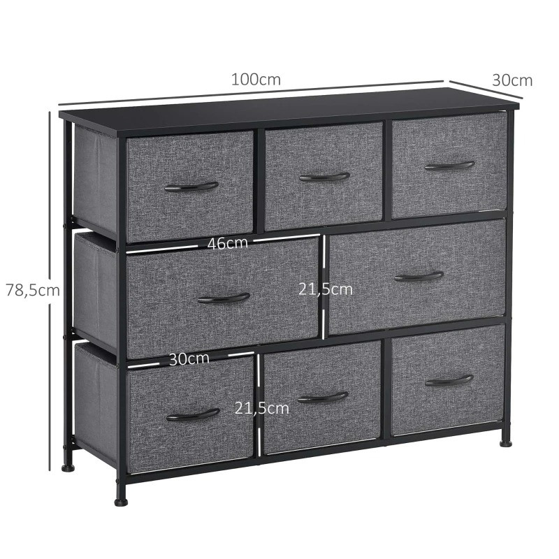 Tato moderní komoda s 8 prostornými látkovými zásuvkami v elegantní šedé barvě je skvělým řešením pro organizaci oblečení, doplňků, dokumentů nebo drobností v domácnosti. Díky své lehké, ale stabilní konstrukci je vhodná do ložnice, předsíně, dětského pokoje nebo i kanceláře.