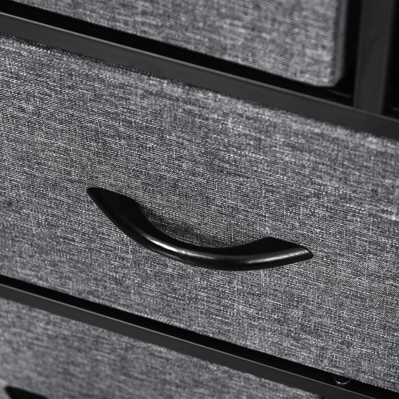 Rám komody je vyroben z odolného kovu, vrchní deska z pevné MDF, což umožňuje využít povrch jako odkládací plochu. Zásuvky z pevné textilie mají úchyty pro snadné otevírání a manipulaci.