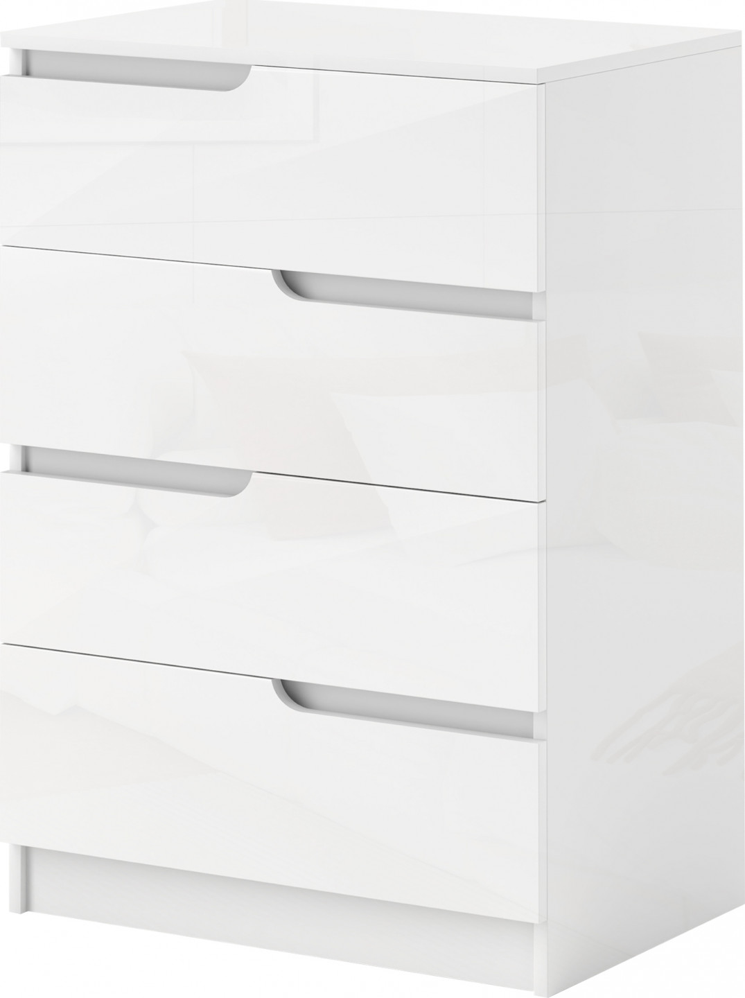 Proměňte svou ložnici pomocí stylové komody. Tato bílá komoda má třídílné ocelové pojezdy pro hladké otevírání a zavírání a zakřivené skryté úchyty, které jí dodávají moderní vzhled. Obsahuje čtyři velké zásuvky, z nichž každá pojme až 24 triček nebo 6 párů džínů. Snadno udržovatelný melaminový povrch zajišťuje trvalou krásu bez větší námahy.