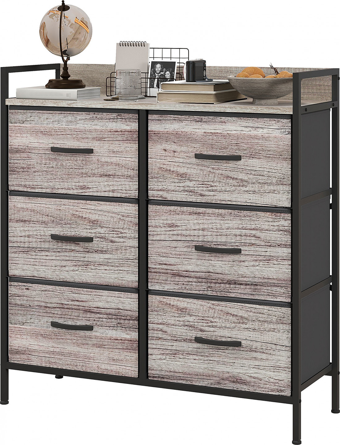 Tato prostorná komoda nabízí jednoduché řešení pro ukládání oblečení v industriálním a rustikálním dřevěném designu. Její minimalistický a flexibilní styl se hodí do mnoha interiérových stylů. Je vybavena šesti zásuvkami, které nabízejí dostatek prostoru pro uspořádání vašeho oblečení. Práškově lakovaný ocelový rám zajišťuje stabilitu, zatímco nastavitelné nožičky zaručují bezpečné postavení.