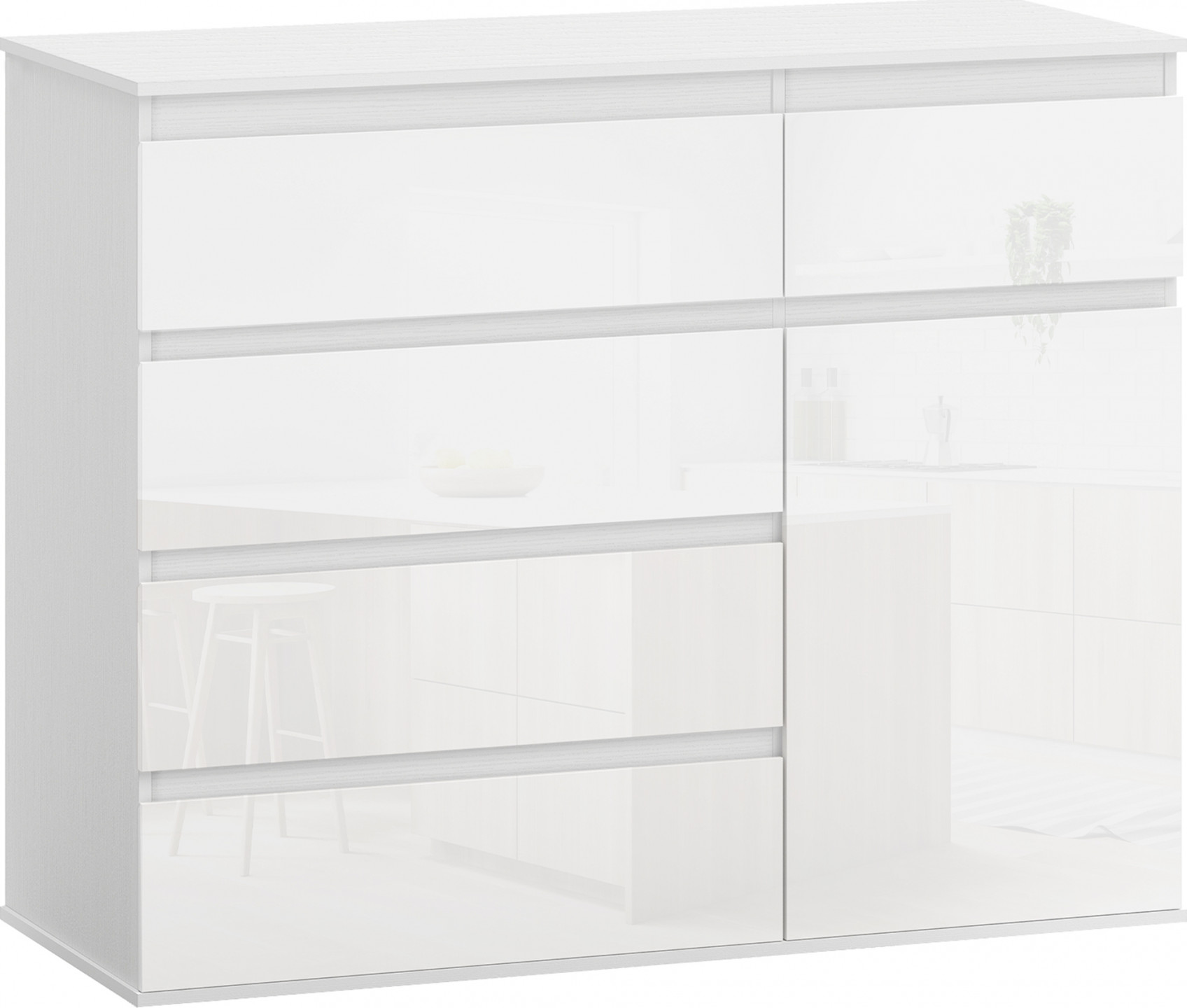 Tento příborník kombinuje moderní linie a praktický úložný prostor v kompaktním formátu. Díky pěti zásuvkám a skříňce s nastavitelnými policemi umožňuje uspořádat různé předměty. Vysoce lesklá lakovaná čela z MDF a konstrukce potažená melaminem poskytují moderní, snadno čistitelný povrch, ideální do obývacích pokojů nebo jídelen.