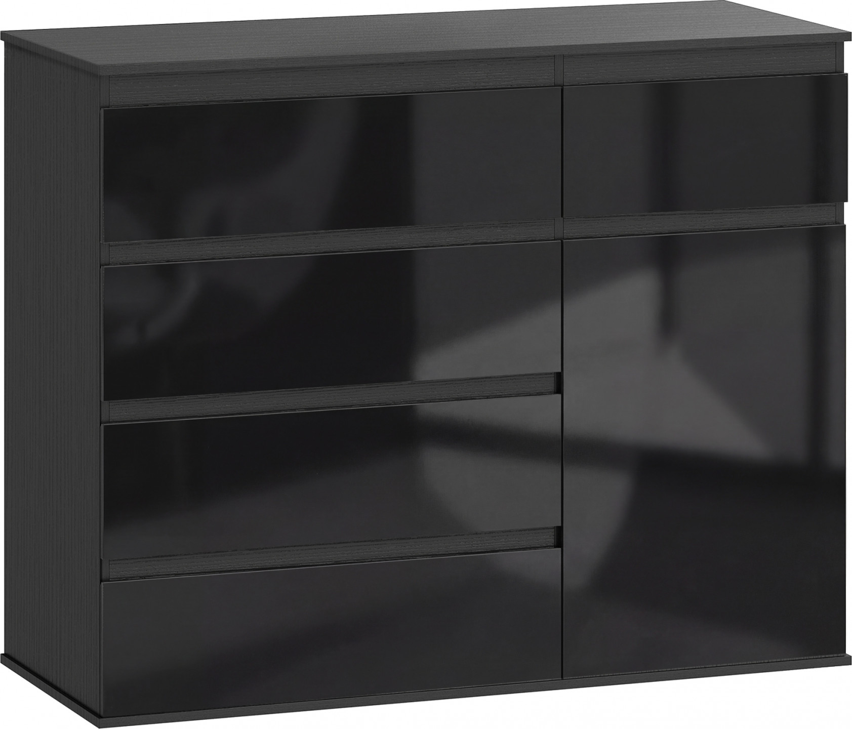 • Černě lakovaná čela z MDF s vysokým leskem v kombinaci se strukturovaným horním panelem pro moderní, snadno integrovatelnou povrchovou úpravu