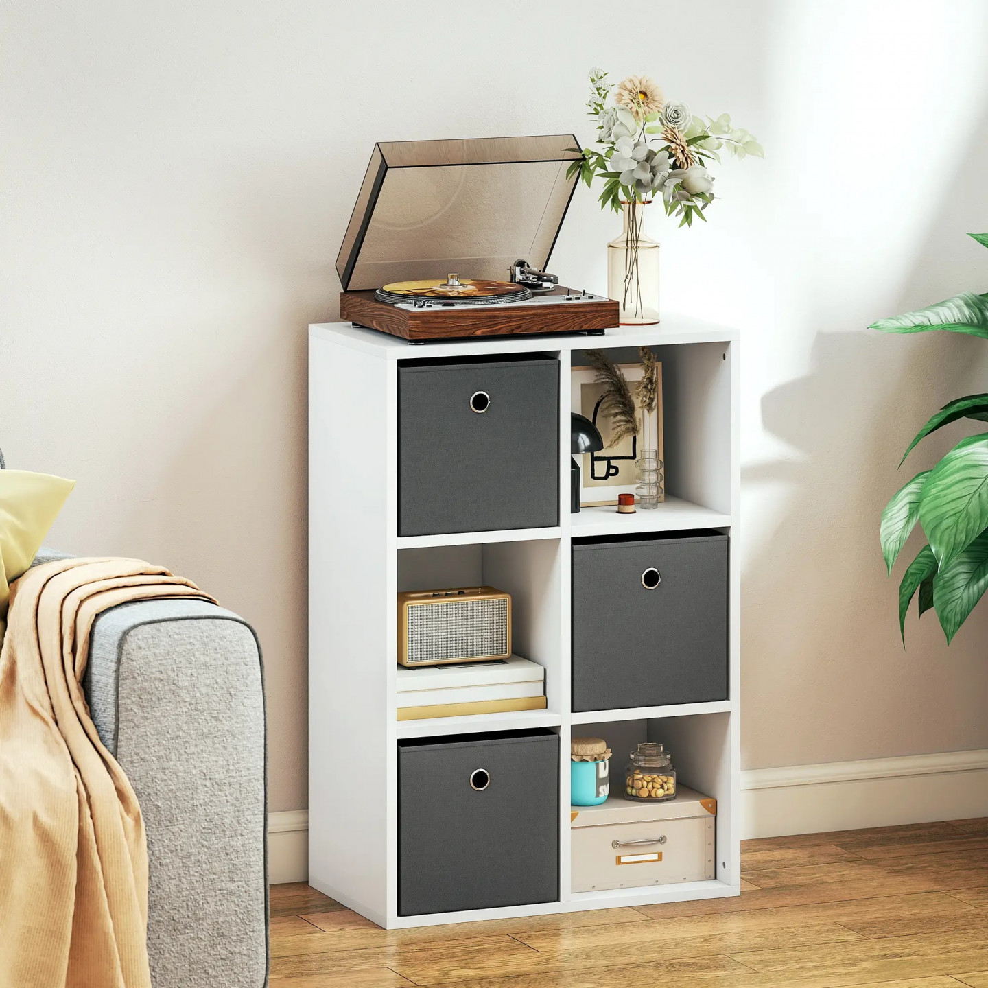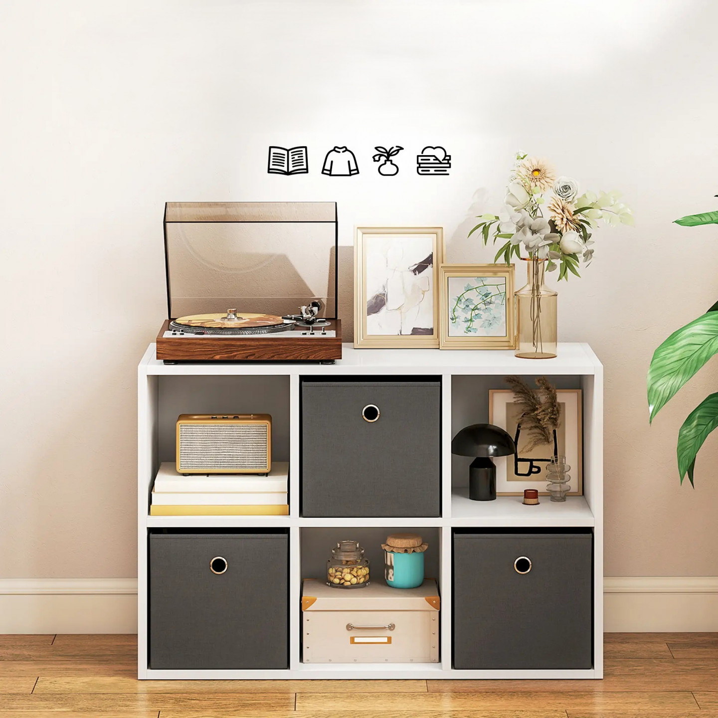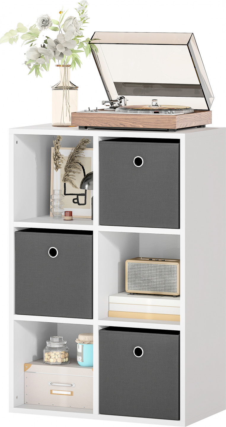 Proměňte svůj přeplněný pokoj v oázu pořádku s tímto úložným prostorem. Představte si obývací pokoj, kde jsou knihy, rostliny a oblečení přehledně uloženy v 6 prostorných kostkách a 3 látkových zásuvkách. Tento regál je vyroben z melaminem potažené dřevotřísky, je odolný proti poškrábání a snadno se čistí. Všestranný design harmonicky zapadne do každé místnosti, ať už ve vodorovné, nebo svislé poloze.