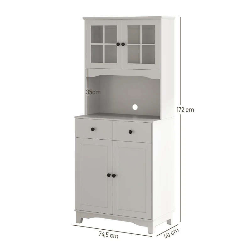 S vitrínou můžete mít vše přehledně uspořádané. Tato prostorná předsíňová skříň má dvě dvoudveřové skříňky a dvě zásuvky, které usnadňují organizaci kuchyňského náčiní. Velká pracovní deska nabízí prostor pro mikrovlnnou troubu nebo kávovar a nechybí ani užitečný otvor pro elektrické kabely. Výšku polic lze také přizpůsobit!