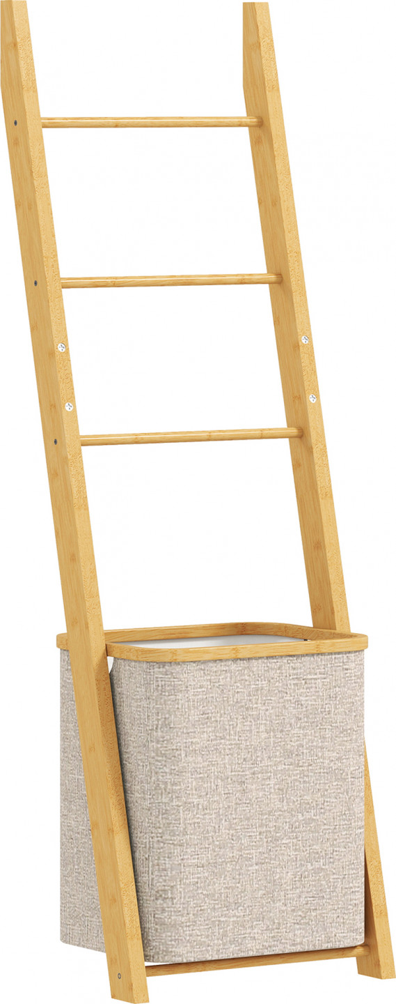 - Tento žebříkový regál obsahuje tři držáky na ručníky a vyjímatelný koš na prádlo o objemu 48 litrů.
