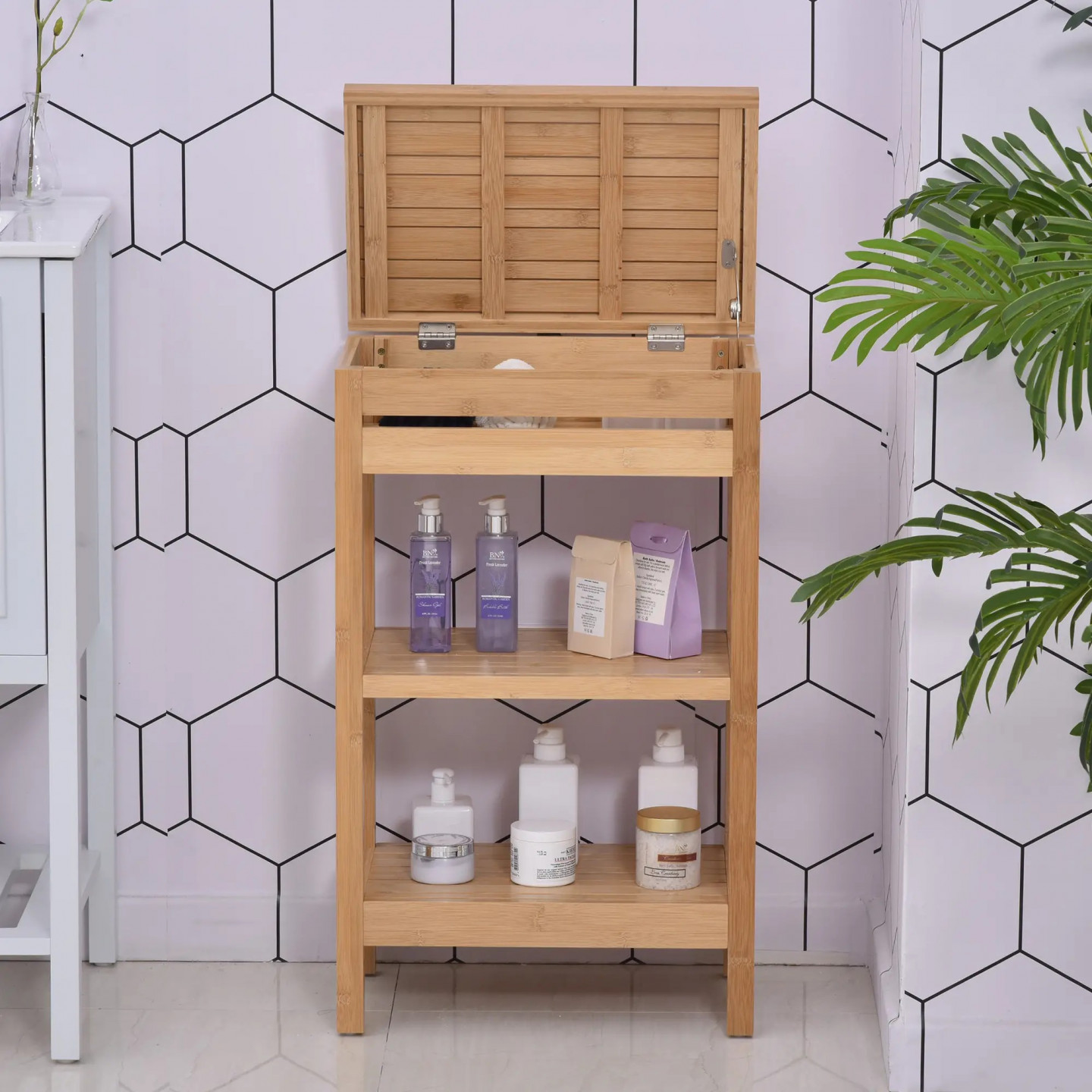 Tato bambusová polička kombinuje styl a funkčnost. Krásný úložný prostor je ideální nejen do koupelny. Kompaktní provedení je ideální pro stísněné prostory. Polička je vybavena výklopným víkem s vnitřní přihrádkou a dvěma otevřenými policemi pro Vaše koupelnové nezbytnosti. Konstrukce ze 100% bambusu je pevná, odolná a snadno se čistí.