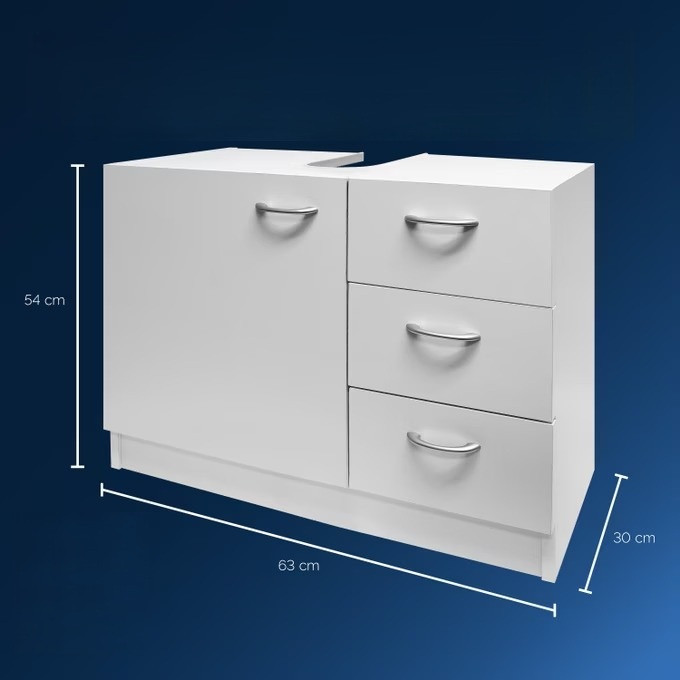 Umyvadlová skříňka Naples přináší do koupelny úložný prostor, organizaci a styl. Díky svým kompaktním rozměrům 63 x 54 x 30 cm se perfektně hodí i do menších prostor. Tři zásuvky a uzamykatelná přihrádka nabízejí dostatek prostoru na ručníky, toaletní potřeby a další koupelnové nezbytnosti. Přesný výřez pro sifon o průměru 10,5 cm pasuje na všechny standardní modely umyvadel.