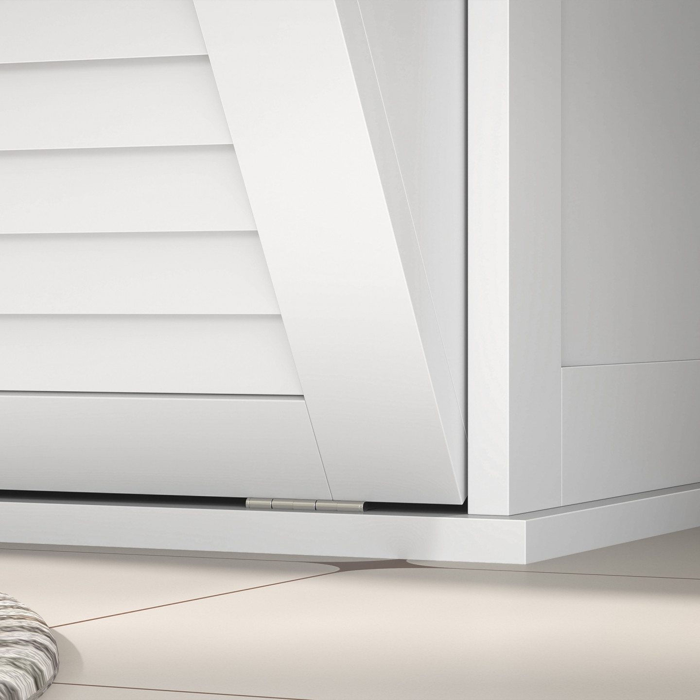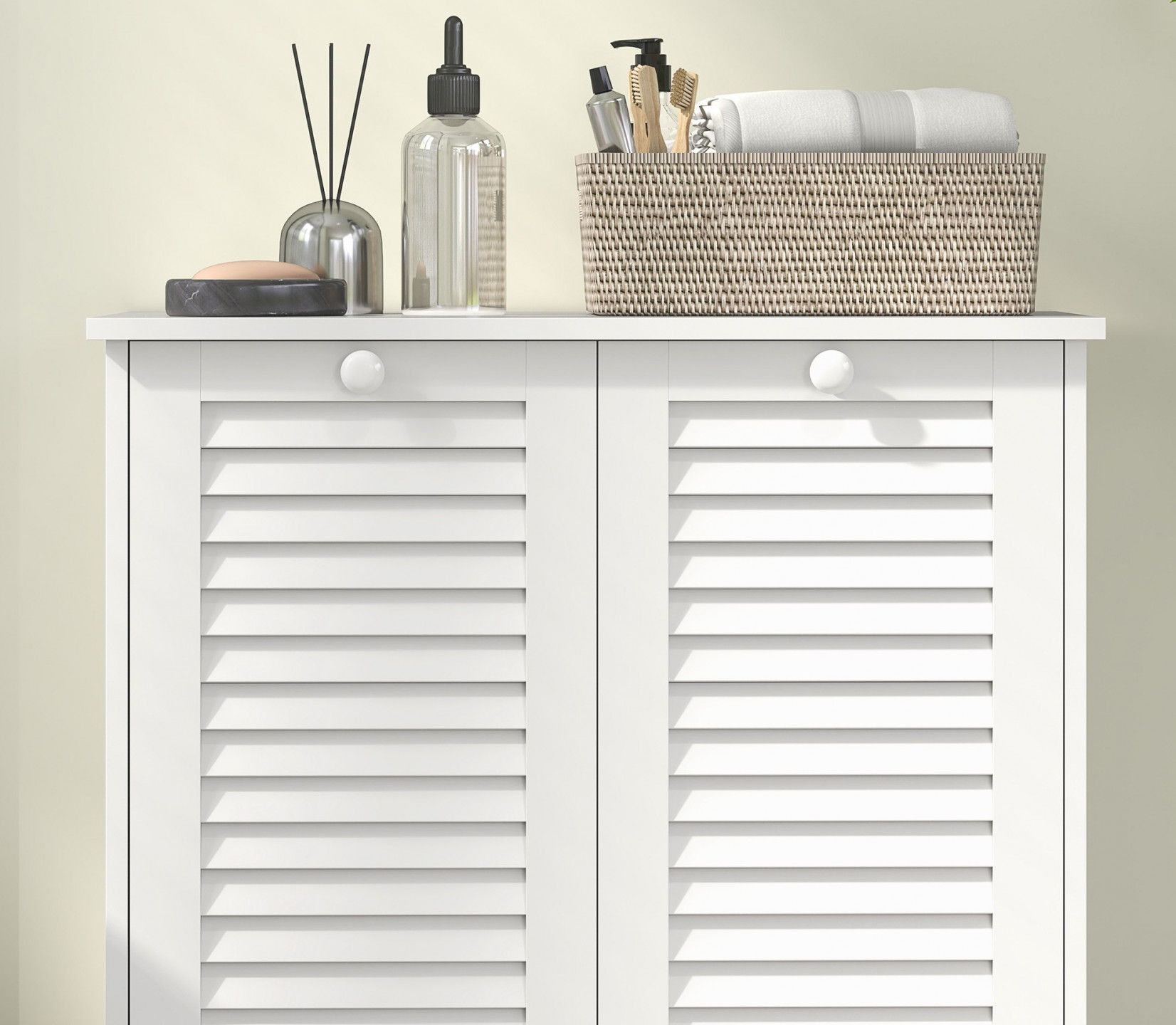 Proměňte svou koupelnu ve stylovou oázu pořádku díky skříni na prádlo. Dva praktické koše na prádlo, které se skládají dopředu, usnadňují organizaci prádla a vytvářejí uklizenou atmosféru. Žaluziová dvířka koupelnové skříňky zaručují svěžest a důmyslná ochrana proti vyklopení zajišťuje bezpečnost. Ideální pro domácnosti, které ocení praktický styl.
