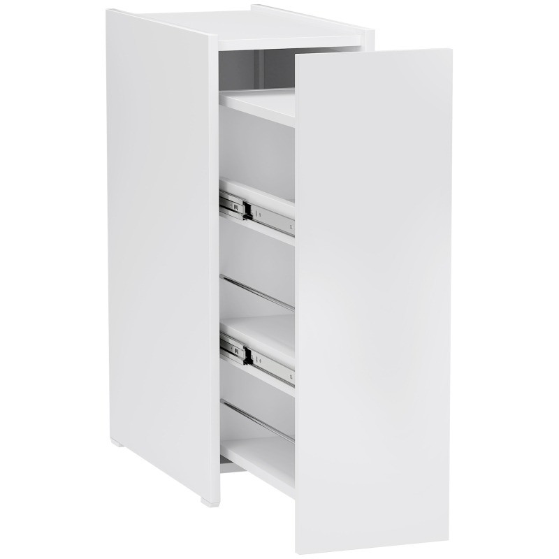 Zažijte nenápadnou eleganci s koupelnovou skříňkou. Zásuvka se čtyřmi hlubokými úrovněmi poskytuje prostor pro toaletní papír, bělidlo, osvěžovač vzduchu a čisticí prostředky a snadno se posouvá na kolejničkách a kolečkách. Kompaktní a elegantní stylový kus nábytku v bílém odstínu se bez problémů hodí do každého výklenku a díky svému elegantnímu designu a rámu z masivní dřevotřísky vylepší vaši koupelnu.