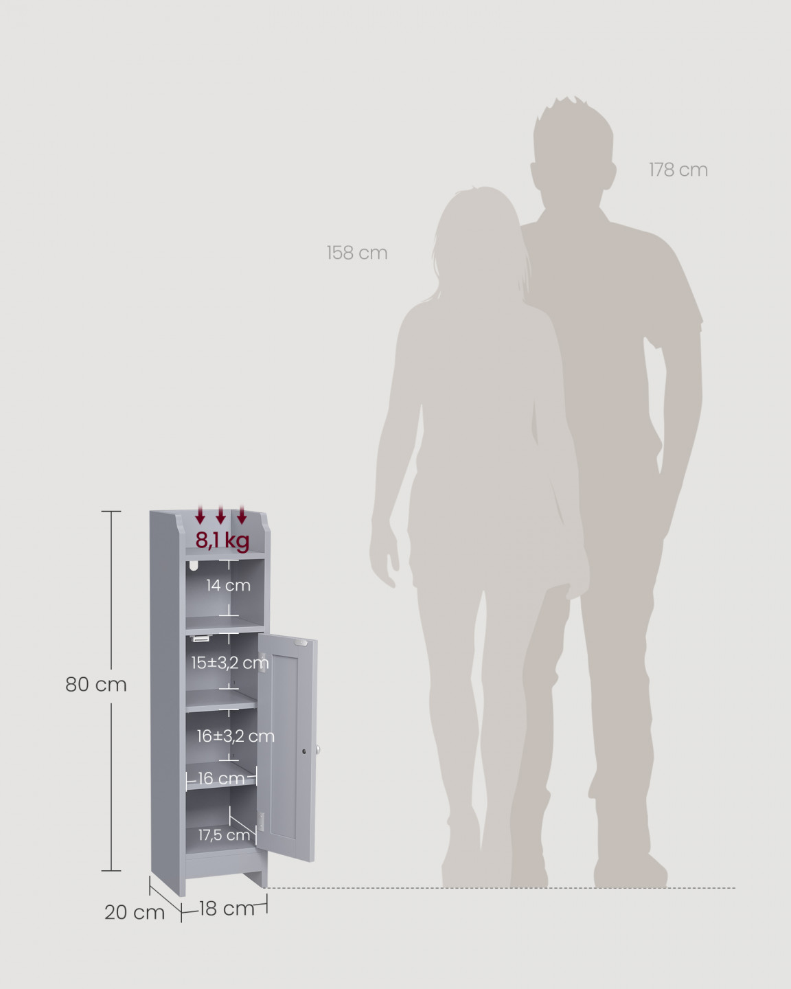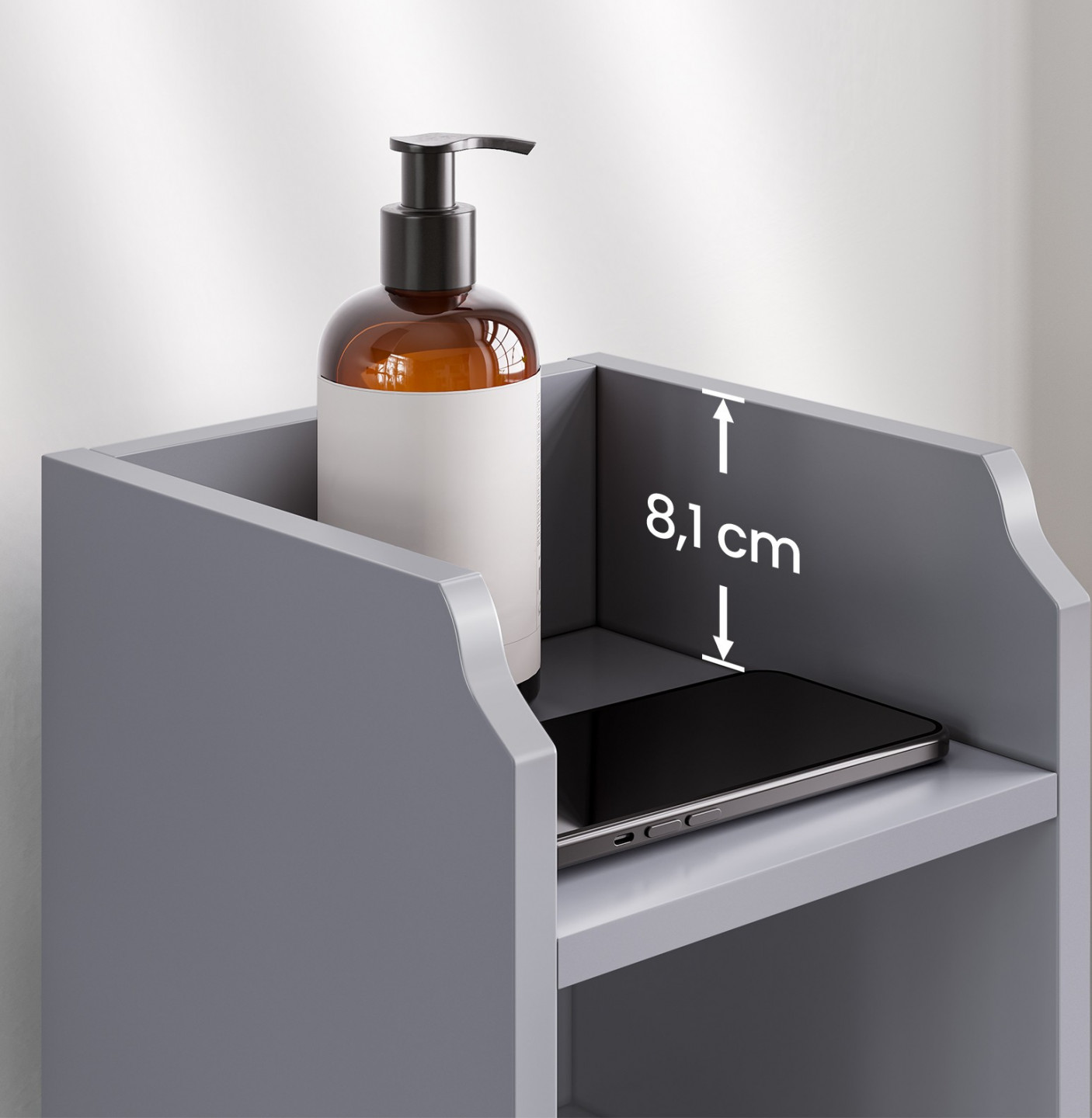 Úzká koupelnová úložná skříňka v šedém provedení je praktický a stylový doplněk do malé i větší koupelny, který pomáhá efektivně organizovat a ukládat vaše věci tak, aby byla koupelna uklizená a přehledná.
