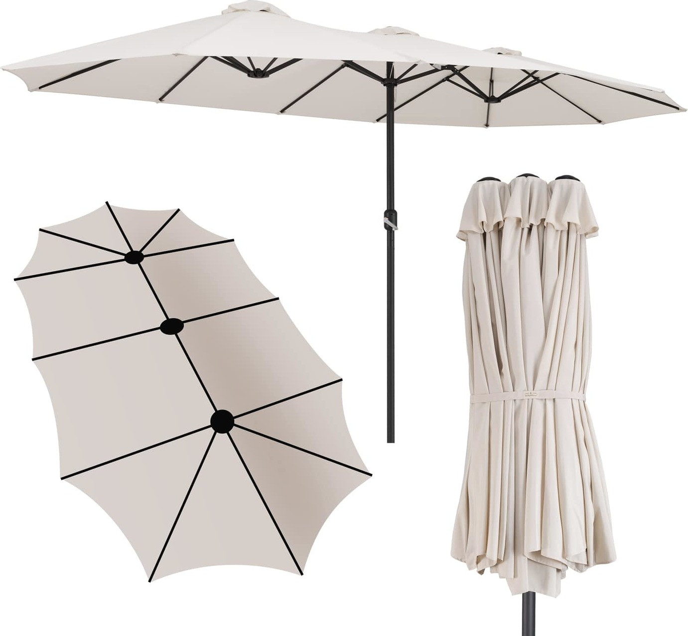 S rozpětím 460 x 270 cm nabízí tento obrovský slunečník mimořádně prostornou ochranu před sluncem pro několik osob . Hladký klikový mechanismus umožňuje rychlé a snadné otevírání slunečníku . Díky UV ochraně 80+ nabízí slunečník optimální ochranu před sluncem a je vaším perfektním společníkem po celé léto. Robustní tyč o průměru 48 mm je vyrobena z vysoce kvalitní práškově lakované oceli a pro snadnější přepravu ji lze rozdělit na dvě části. Tři větrací otvory na horní straně slunečníku zajišťují ještě větší stabilitu, protože vzduch zespodu může unikat nahoru, aniž by ovlivňoval stínidlo. Tím se také zabraňuje hromadění tepla pod dvojitým slunečníkem.