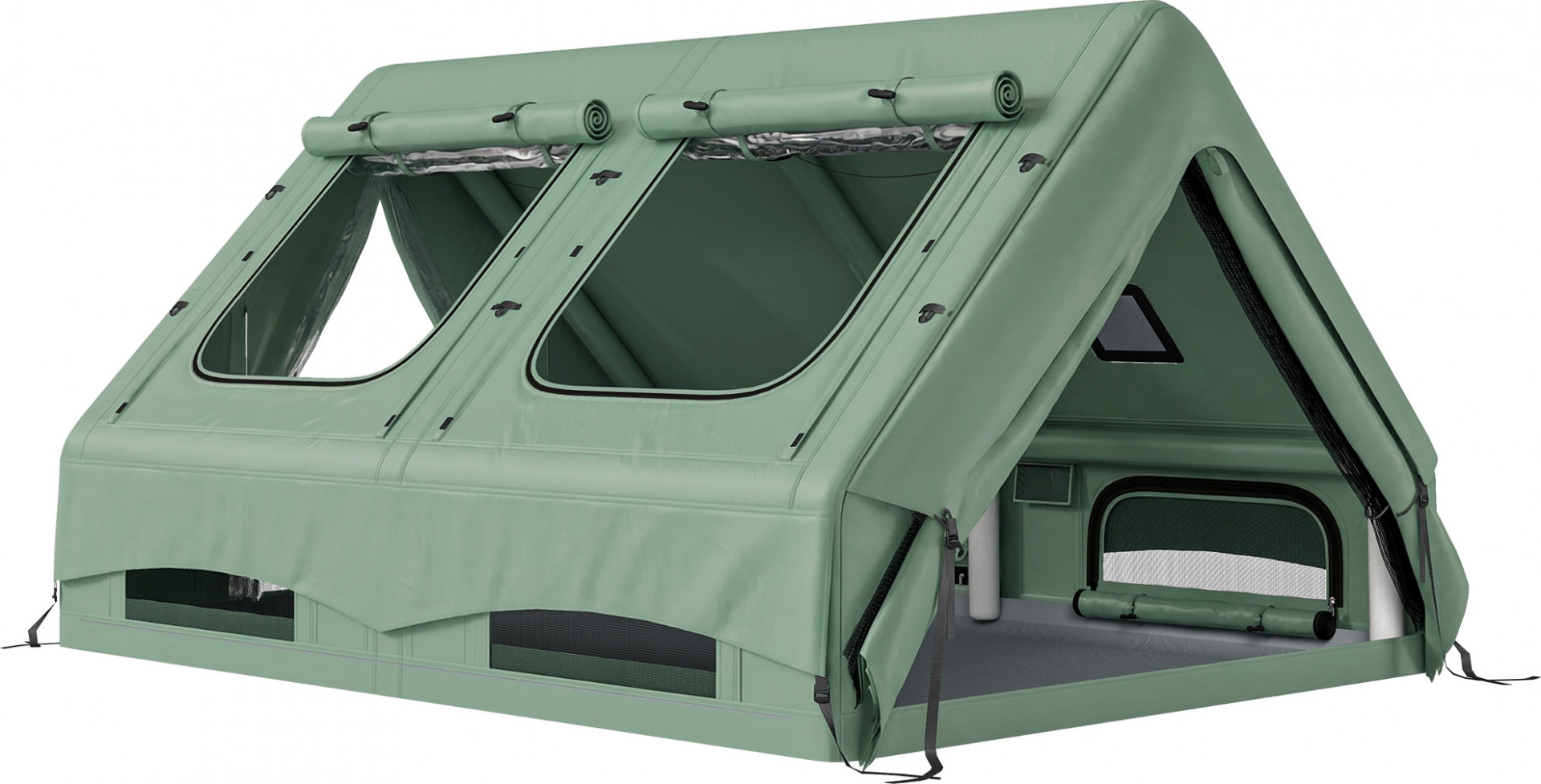 Zažijte luxus a odolnost s nafukovacím kempingovým stanem. Tento prostorný glampingový stan o rozměrech 4 x 3(m) je určen pro rodiny a outdoorové nadšence, kteří ocení pohodlí, a během pouhých 3 minut promění váš kemp v útulný domov z domova. Díky odolné tkanině 420D Oxford a vodnímu sloupci 10 000 mm+ zůstanete pěkně v suchu i na mokré zemi.