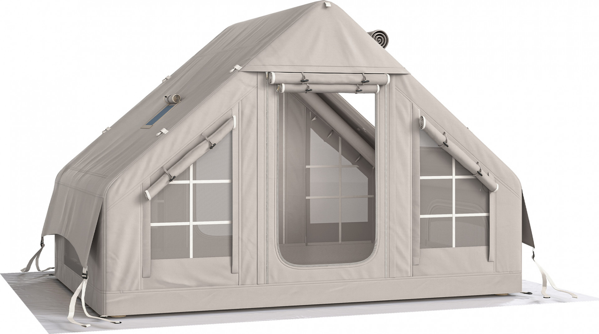Nafukovací kempinkový stan nabízí rychlé postavení (3 minuty), 5000mm vodotěsnost, UPF30+, odolnou podlážku a prostor pro 6-8 osob vsedě a 5 osob vleže. Díky panoramatickým oknům, střešnímu oknu, odolnosti proti větru (stupeň 7), ohnivzdornému připojení kamen a síťovině odolné proti poškrábání je tento nafukovací stan ideální do každého počasí. Příslušenství: ruční pumpa, kotva do země, provazy proti větru, opravné záplaty, úložná taška.