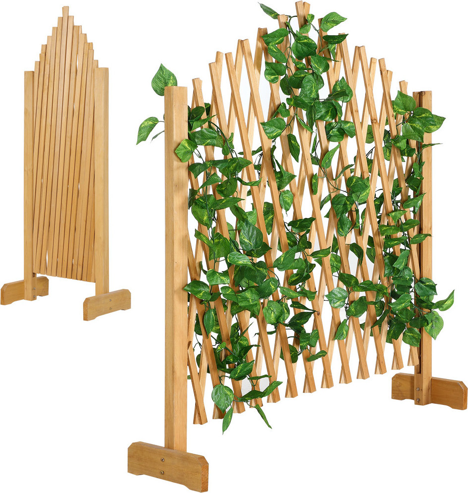 Všestranný pomocník ve vaší domácnosti! Tato krásná treláž ozdobí váš domov. Praktická mřížka na rostliny je volně stojící a lze ji použít jako zahradní plot, dělicí stěnu místnosti nebo jako mřížku pro různé popínavé rostliny. Dřevěný plot lze rozšířit na šířku 200 cm. Můžete jej také zcela složit, abyste při skladování ušetřili místo. Díky tomu lze velikost optimálně přizpůsobit vašim potřebám. Mřížový plot je volně stojící a lze jej použít jak uvnitř, tak i venku. Mříž můžete také použít na zahradě jako zahradní plot nebo v interiéru jako dělicí stěnu mezi místnostmi. Montáž a demontáž rostlinné mřížky je hračka a zvládnete ji bleskově. Šířku si můžete nastavit jednoduše odtažením plotu a nožičky umožňují volné postavení mřížky bez nutnosti speciálního upevnění.